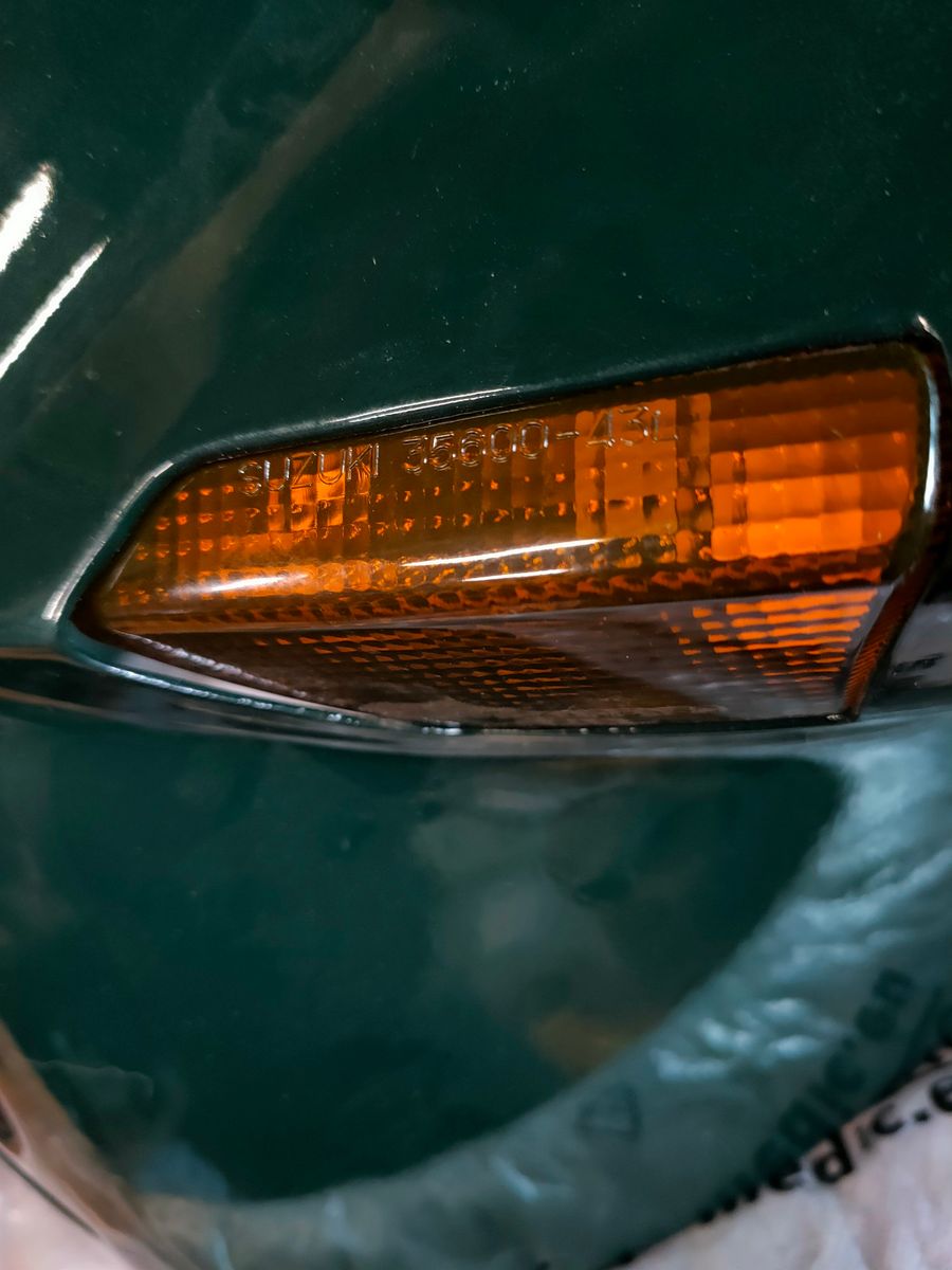 Die Blinkeröffnungen sind ein paar mm zu klein. Auf dem Foto müsste man links einiges wegarbeiten, damit die Asia-Leuchten ganz reinflutschen. Habe sie erstmal so festgezurrt - fällt kaum auf. Vielen Dank nach Gerstetten für die Überlassung der raren Dinger.