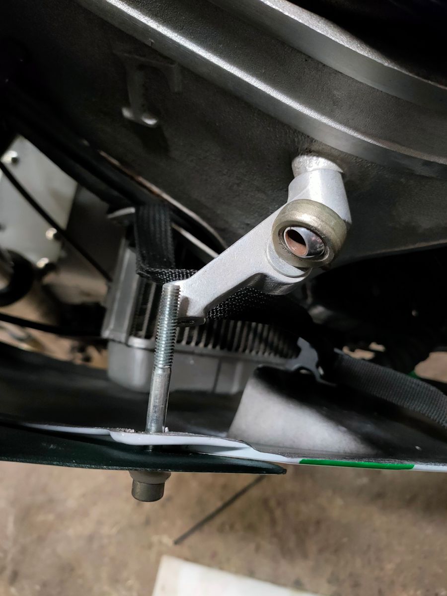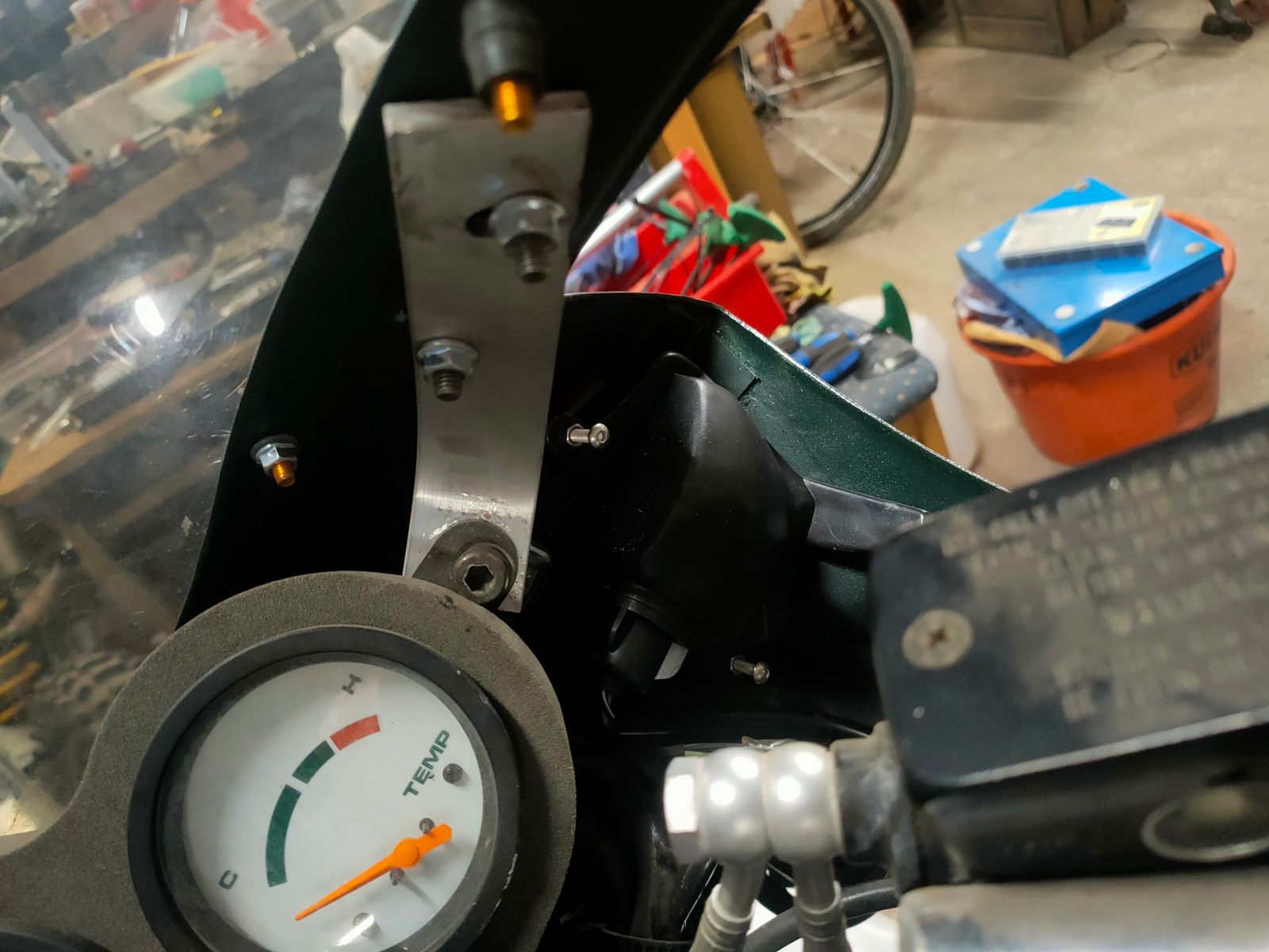 Links ist um ca 15 mm verpeilt. Am Fixpunkt oben und am Kielhalter geht gar nichts. Kann auch mit am großen Kühler liegen, denn auch das "original" Nachbauteil lässt sich dort nur mit freundlichem Nachdruck verschrauben. Wenn etwas Ruckelei bei gelöster Frontverkleidung nix bringt, bastel ich neue Halter. Keine große Sache.