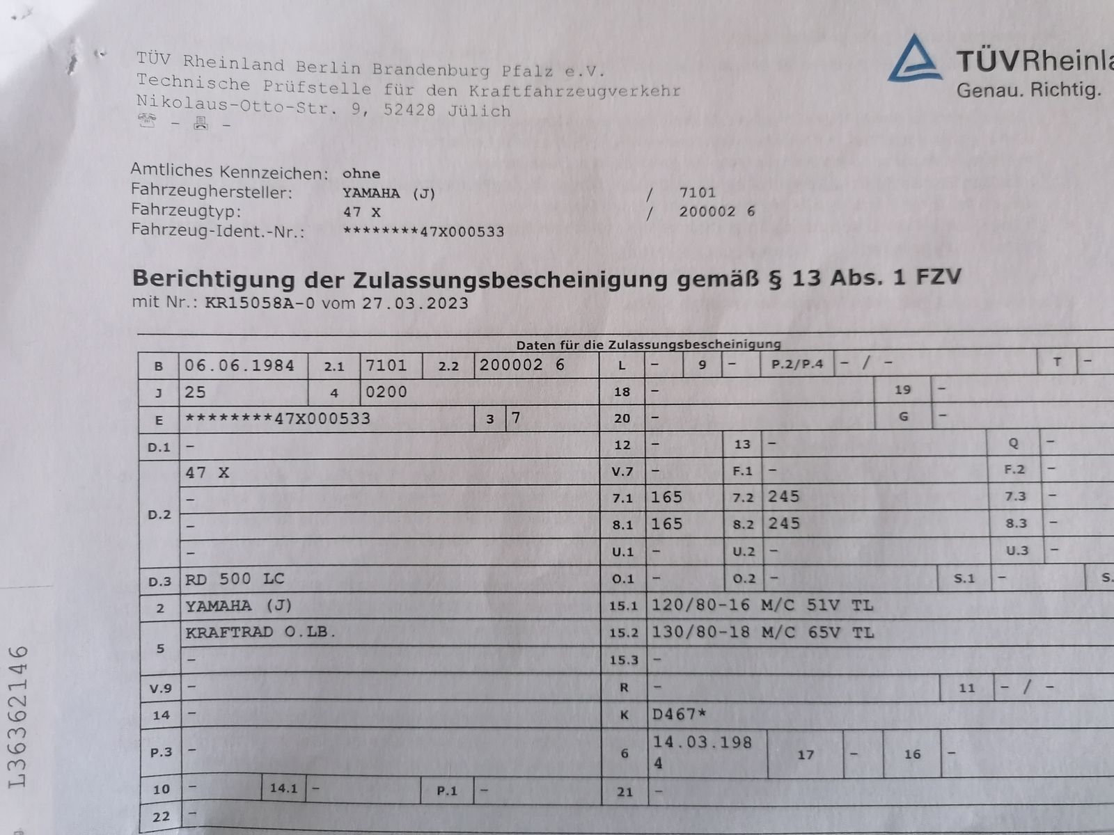 für Reifen vorn: 120/ 60 V16TL ( fälschlicherweise ) eingetragen steht.