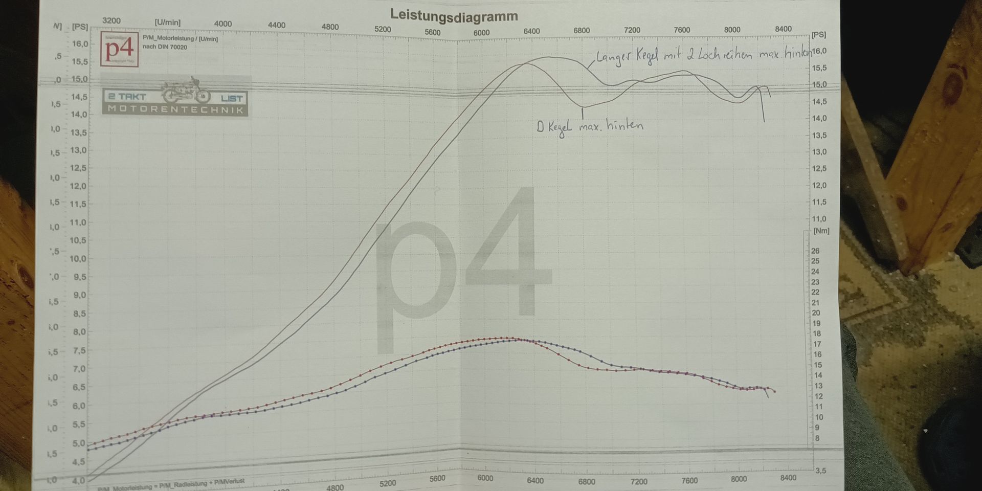 Als Tipp zum Endkonus kann ich dir vielleicht noch geben, dass ein zweiteiliger Konus (also zwei Steigungswinkel) und knackig kurz (vielleicht insgesamt so ca. 180 -200mm) wahrscheinlich zu einem besseren Ergebnis führen wird. Der Grund dafür ist der geringe Vorauslass, der den rückströmenden Gasen nicht so viel Zeit für die Überladung gibt. Mit hin und her schieben kannst du dann ja wie schon von dir gemacht, die gewünschte Resodrehzal einstellen.