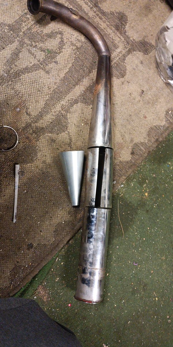 Ich habe mir noch einen geschlossenen 14cm langen Konus besorgt und passend bearbeitet um ihn weit hinten im Auspuff positionieren zu können.