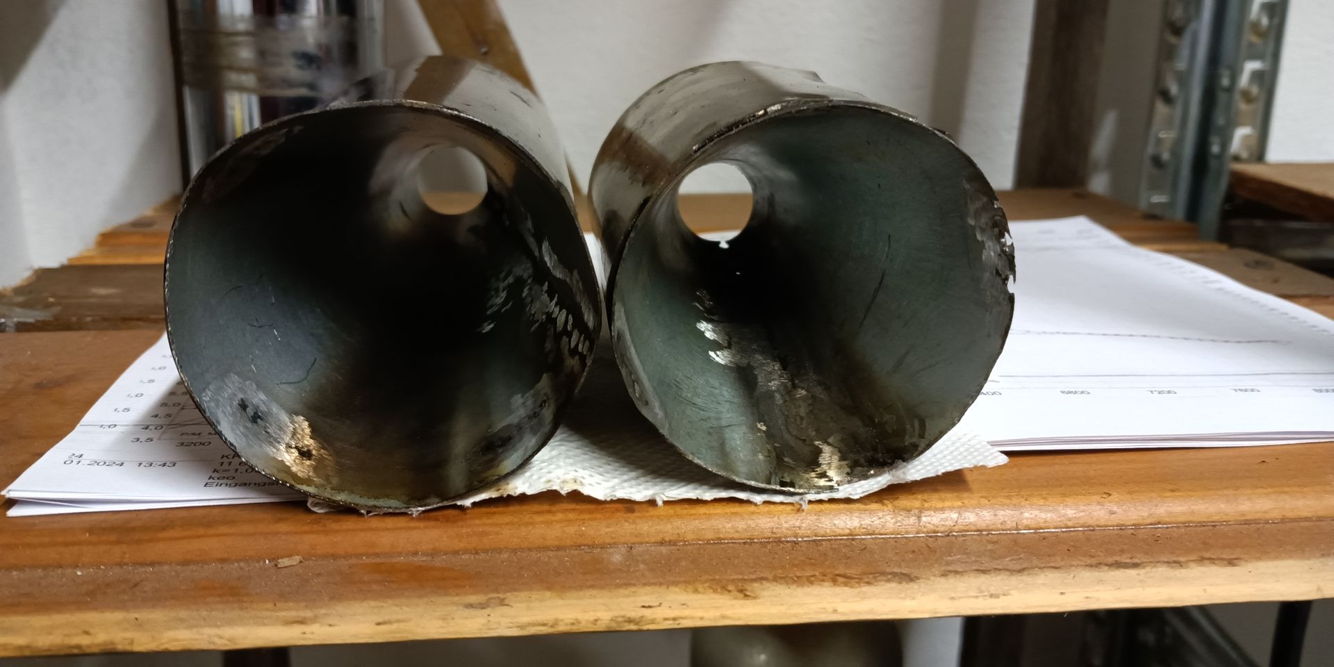 Die 2 letzten Schalldämpferrohre überlappen dabei natürlich das Endrohr in der Endtüte um nochmal was für die Schalldämpfung zu tun.