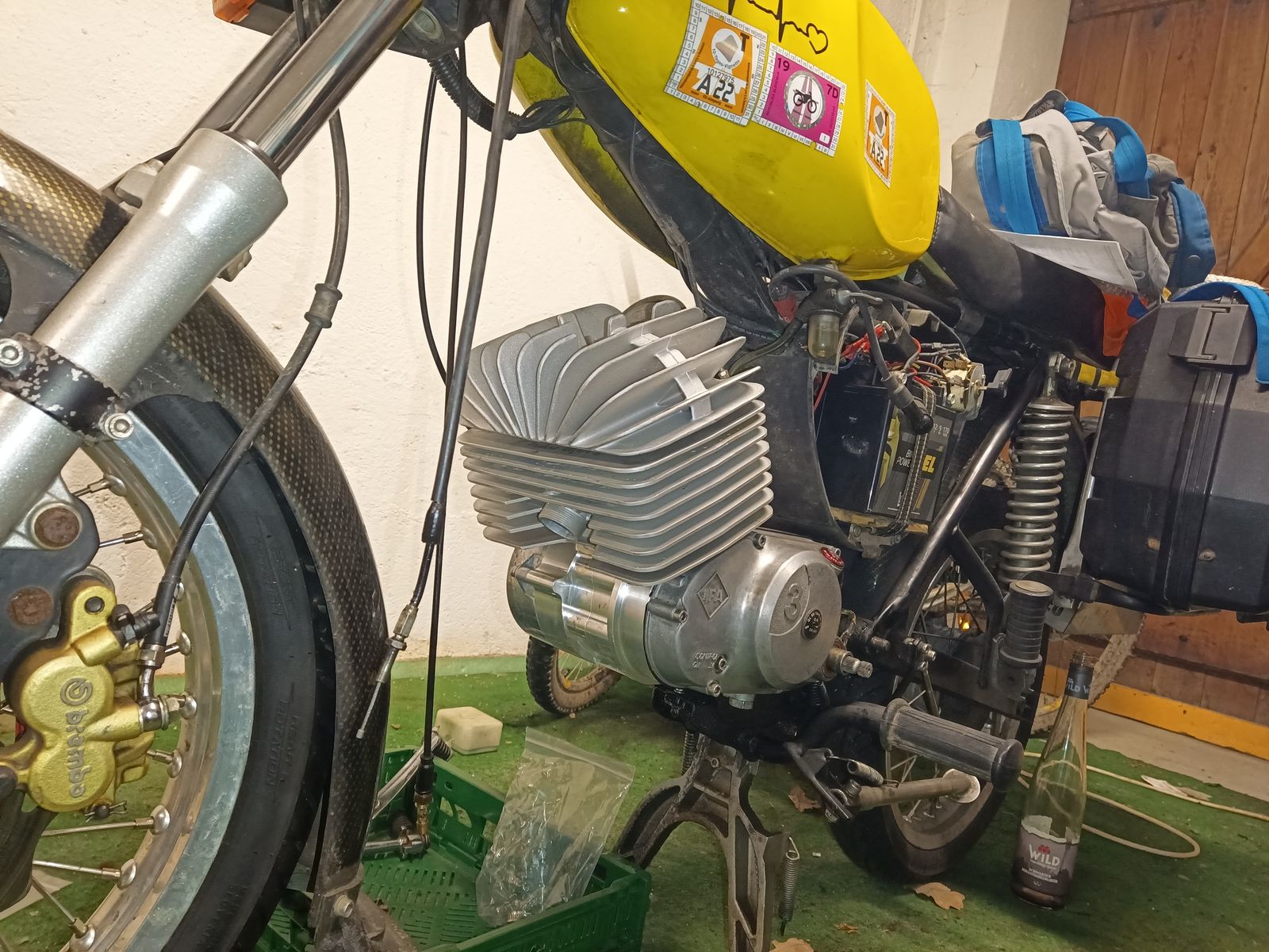 Die ersten 50km sind abgespult mit dem neuen Triebwerk. Jetzt wird es noch Zeit etwas gegen die klirrenden Kühlrippen zu tun, dazu stemme und verklebe ich kurze Gummiwürste zwischen die Rippen. Ansonsten kann es sogar passieren das die Rippen bei der Fahrt abbrechen (ist mir schon mal passiert)