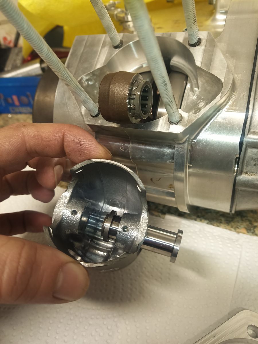 Ich habe das breiteste verfügbare Nadellager für 19mm Pleuelauge und 14mm Kolbenbolzen verwendet, die restlichen 5mm Axialspiel füllen 2 Ausgleichsscheiben auf.