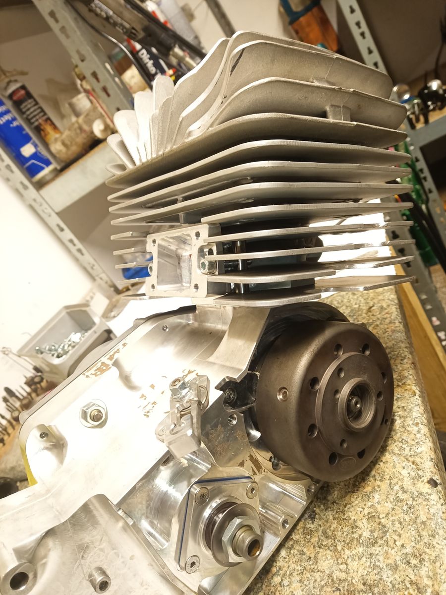 Der Zylinder ist fertig gefräst, zahme 175° Auslass und 120° Überströmersteuerzeit sind es am Ende auch geworden, wie geplant. Ein Spacer hat die CNC auch ausgespuckt um die letzten 7.5mm zu realisieren damit der Kolben OT gleich Buchsenoberkante ist.