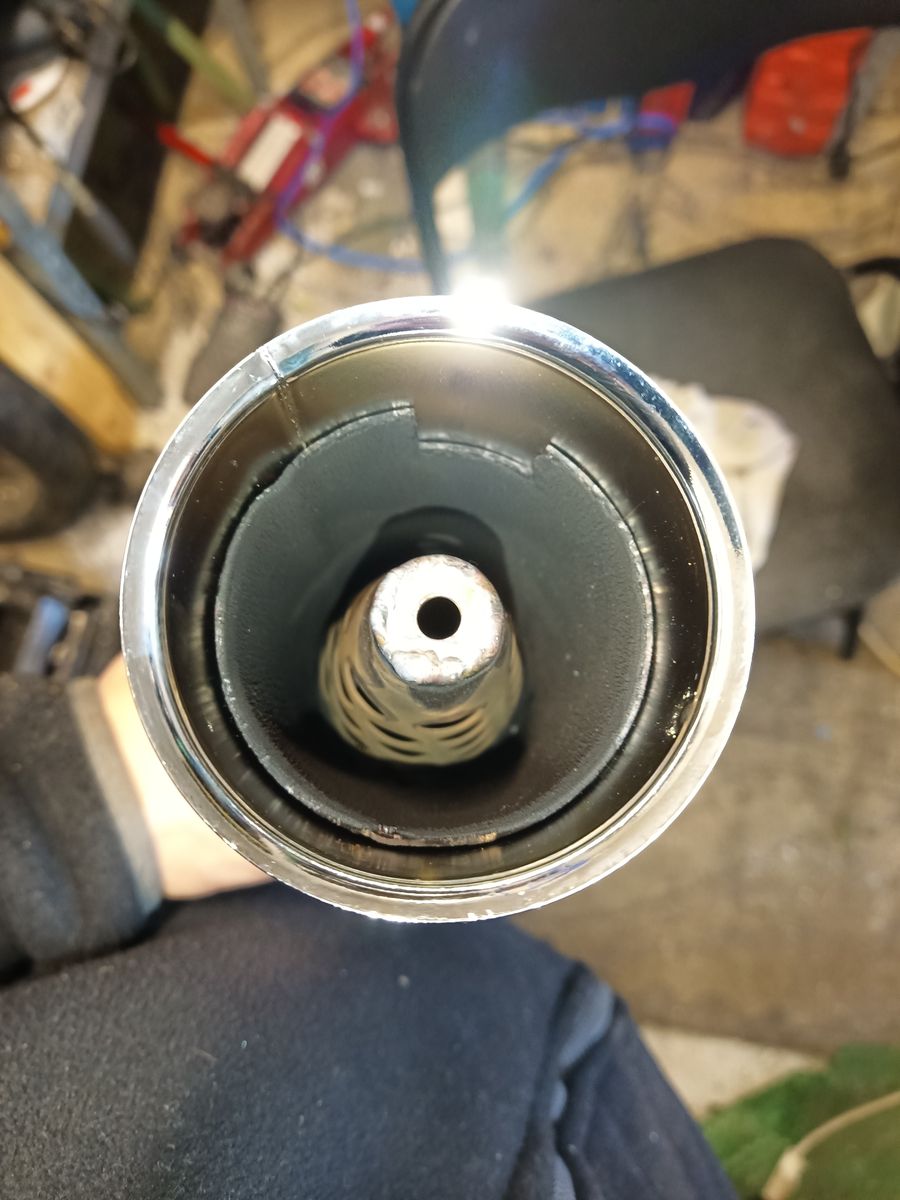 Ich habe mir noch einen geschlossenen 14cm langen Konus besorgt und passend bearbeitet um ihn weit hinten im Auspuff positionieren zu können.