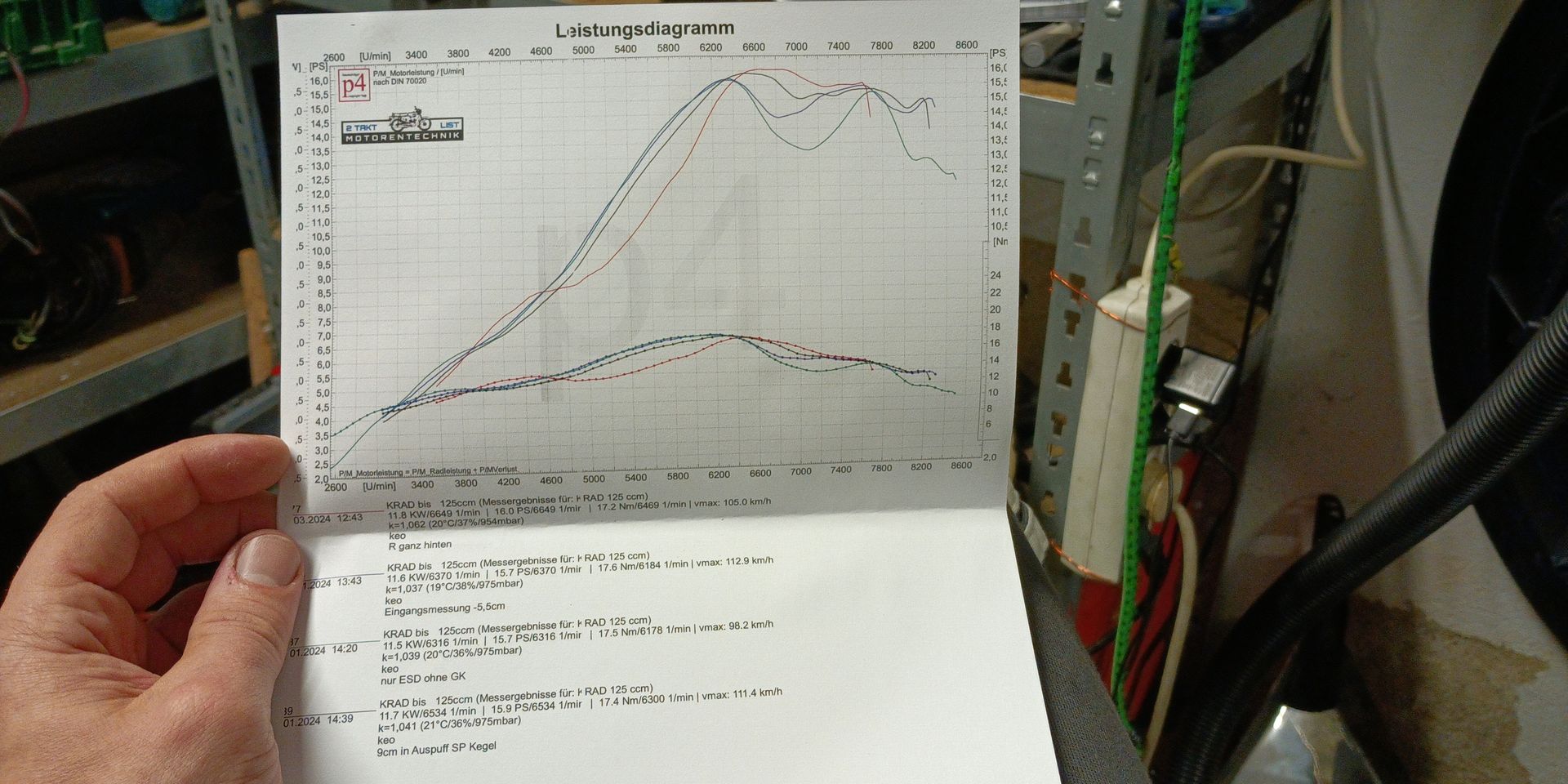 Noch mal ne kleine Anmerkung zu deinen Tests: Wie man anhand den Messungen sehen kann, funktioniert dein Auspuff in etwas höheren Drehzahlen besser. Das liegt auch daran, dass du den Krümmer etwas gekürzt hast. Für tiefere Drehzahlen sitzt dein Diffusor nun etwas zu weit vorne. Wenn ich das richtig verstanden habe, hast du den kurzen 140er Endkonus nur an der hintersten Position getestet? An dieser Position (zu weit hinten) harmoniert er dann nicht mehr gut mit dem restlichen Auspuff, also mit dem Diffusor der für höheren Drehzahlen besser sitzt (du erinnerst dich an die PN?).