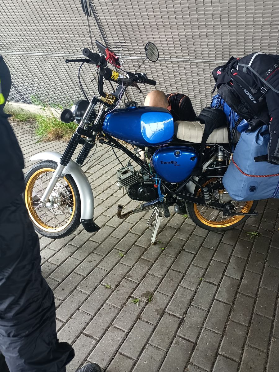 Und am Samstag beim Tanken, die blaue 125er Simme wo meine Finger auch beim Zylinder bearbeiten waren..ein Radlagerschaden, aber wir haben ja alles dabei :D