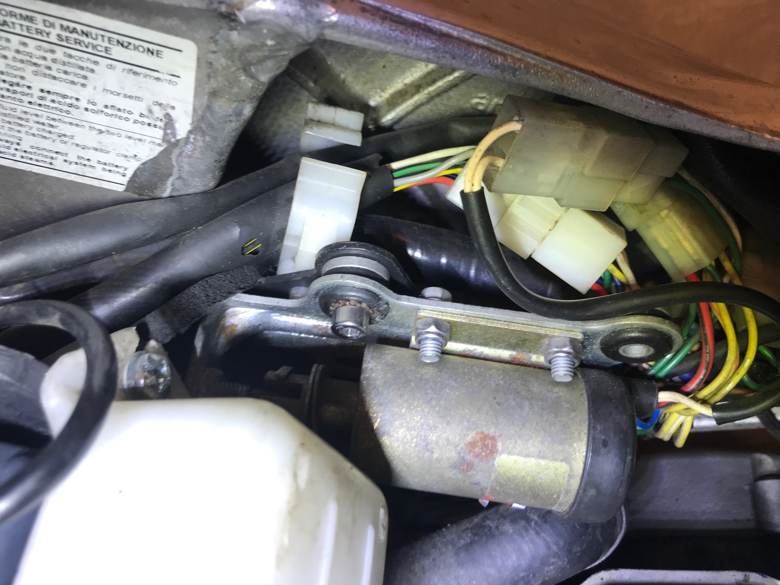 • Der Soleniod gehört eigentlich weiter vorne montiert, neben dem Ausgleichsbehälter. Da ist der zweite Anschraubpunkt. Funktioniert aber übergangsweise höchstwahrscheinlich auch so.