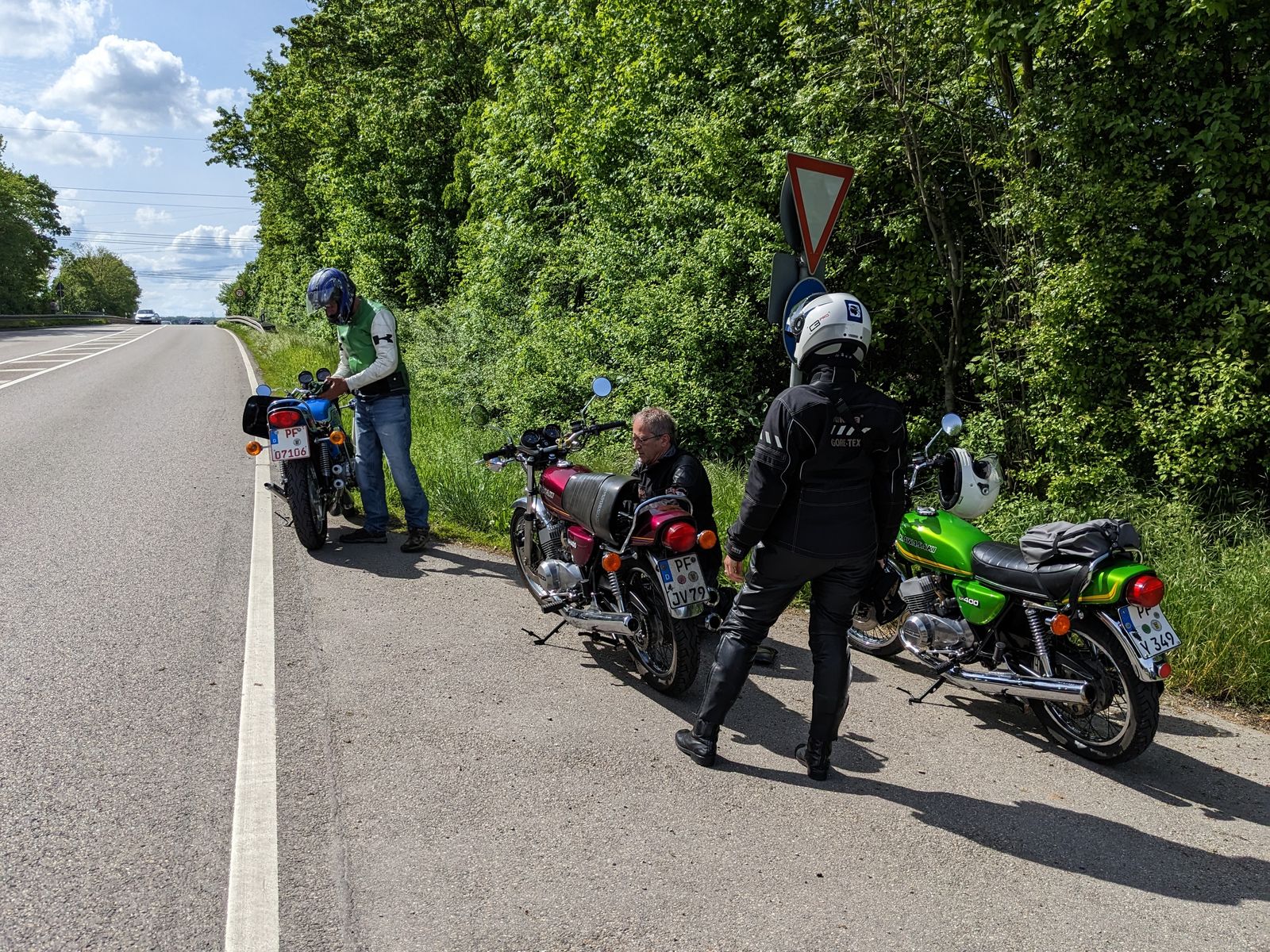 Frank hatte seine H2 (`72) erstmals dabei auf der Strasse und unsere Damen fuhren ihre frischgeschliffenen KH 400 mit limitierter Drehzahl ein ...