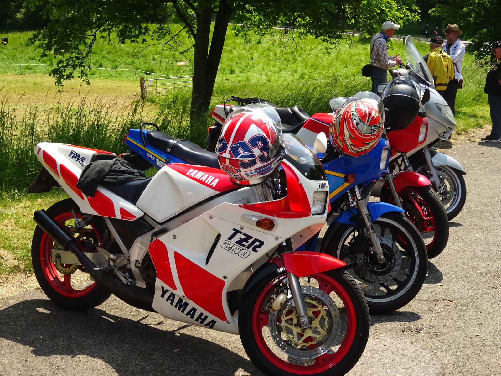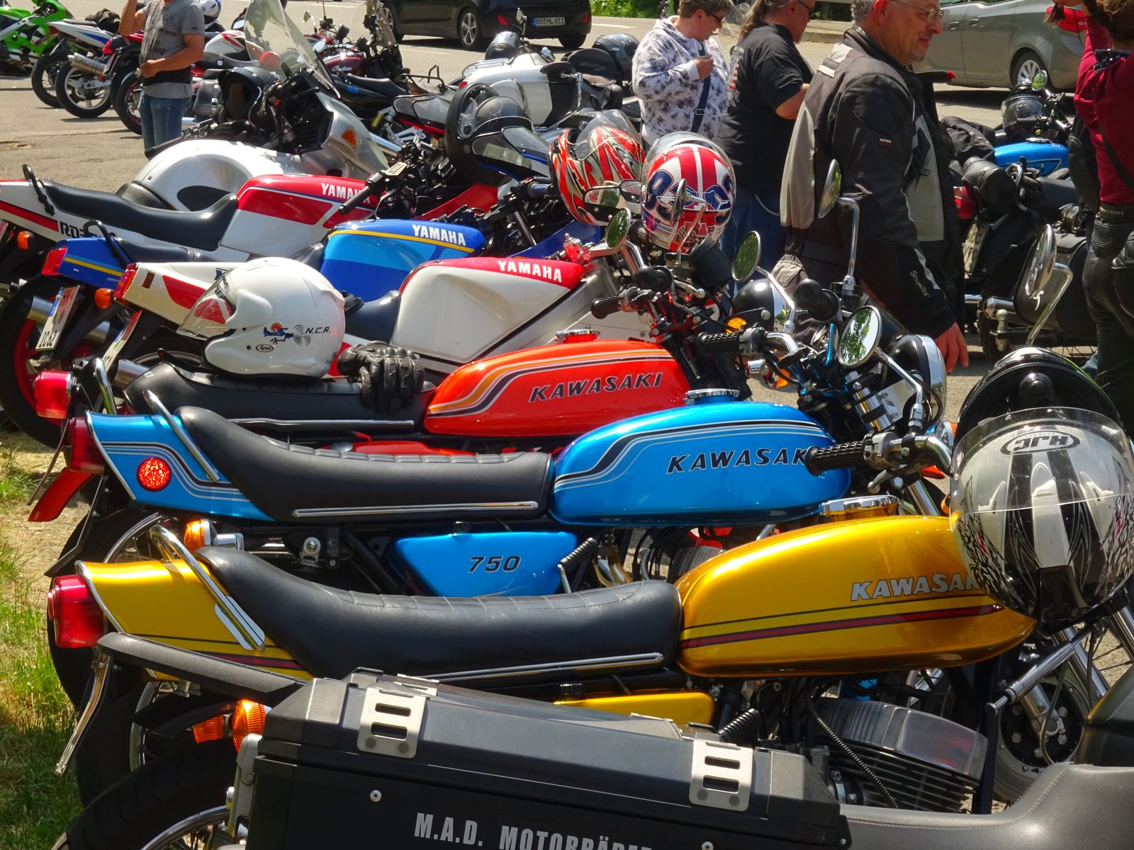 Wir waren gestern erstmals gemeinsam an der Tüde . Ute mit der S2 -Frank mit Julia mit der KH 400( Genannt Norbert) und seiner H2, welche sich noch in der Abstimmungsphase befindet , aber schon sehr schön läuft , nicht zuletzt weil bereits eine Gummilagerung des Motors vorbestehend war . Dazu kam Klaus mit seinem Sohn Luca, beide RD 350 YPVS in rot und blau .