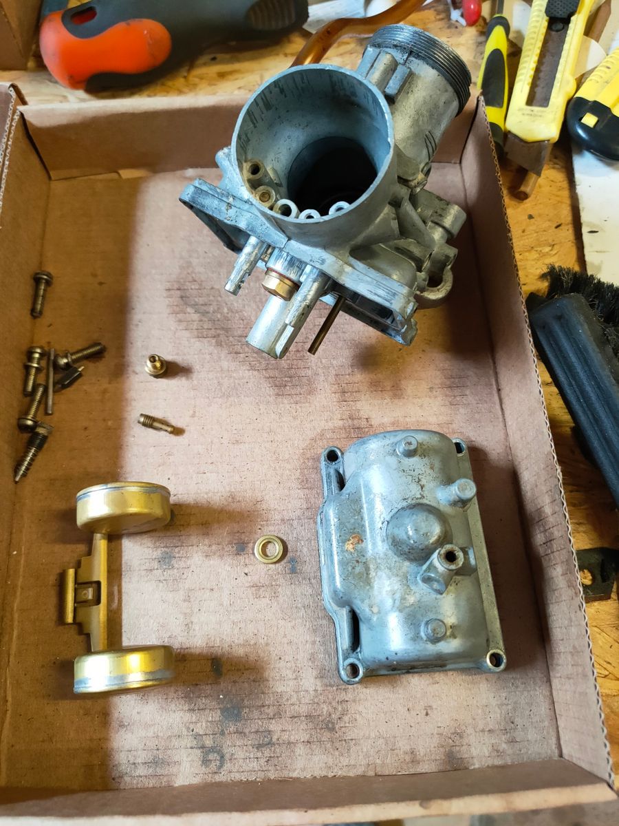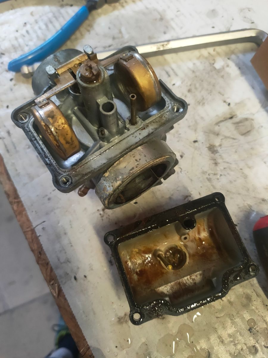 Erstaunlich der Zustand der Vergaser im Inneren: Kaum Korrosion, minimale Ablagerungen. Einmal abduschen und Durchpusten und schon sauber. Eine "Sickergrube" ist durchoxidiert. Zugeklebt und mit den alten Dichtungen wieder zusammengebaut, die wie das Gummiteil zwischen Vergaser und Luffi noch elastisch und rissfrei sind.