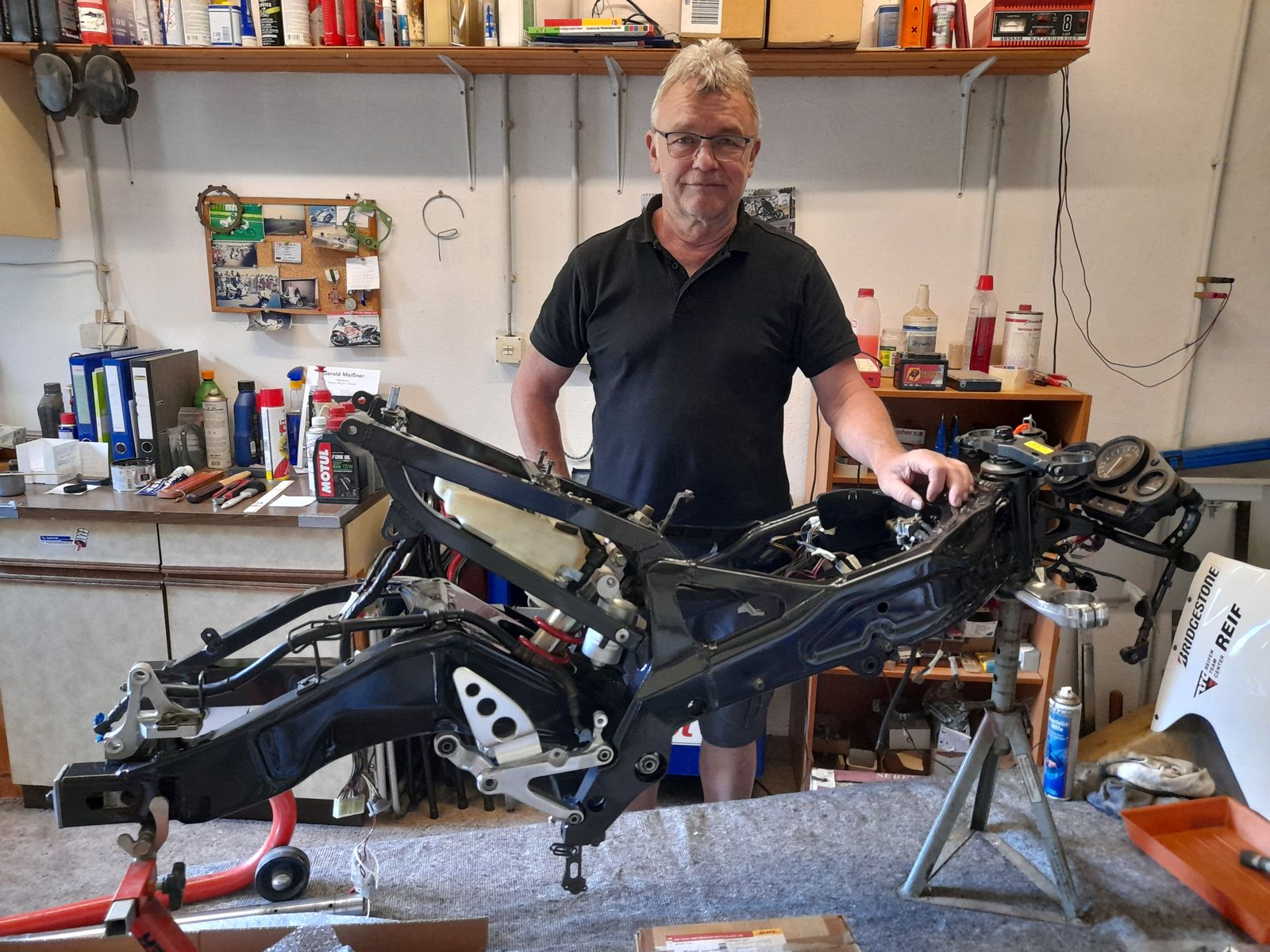 Am 18.11.21 ging es los. Von Mitte Dezember bis Mitte Januar passierte fast nichts wegen einer schweren Erkrankung mit Todesfolge in der Familie. Am 09.02.22 lag alles zerlegt da. Das linke Schwingenlager war festgerostet und das Schwingenrohr korrodiert. Die Fahrwerksteile wurden intensiv gereinigt und am 19.02.22 gingen Rahmen und Schwinge zu einem Motorsportfreund zum Lackieren, Anfang April war alles fertig im Originallack.