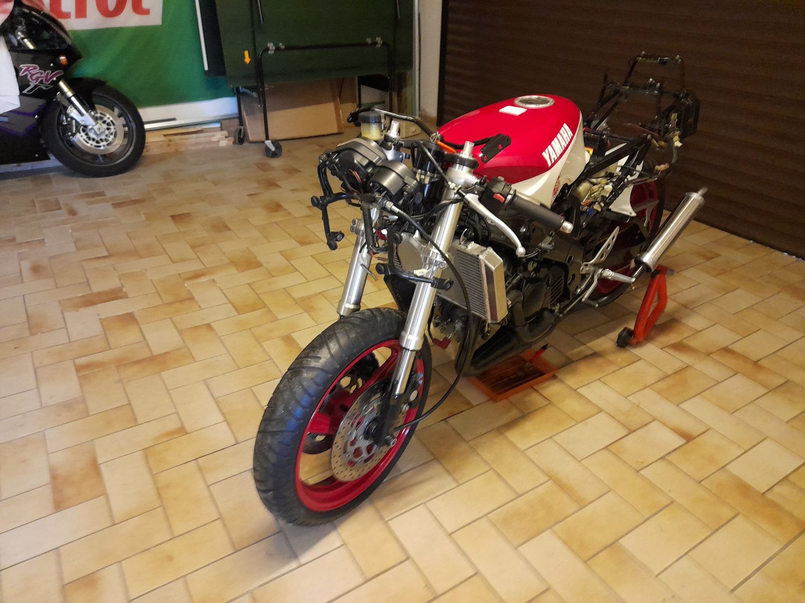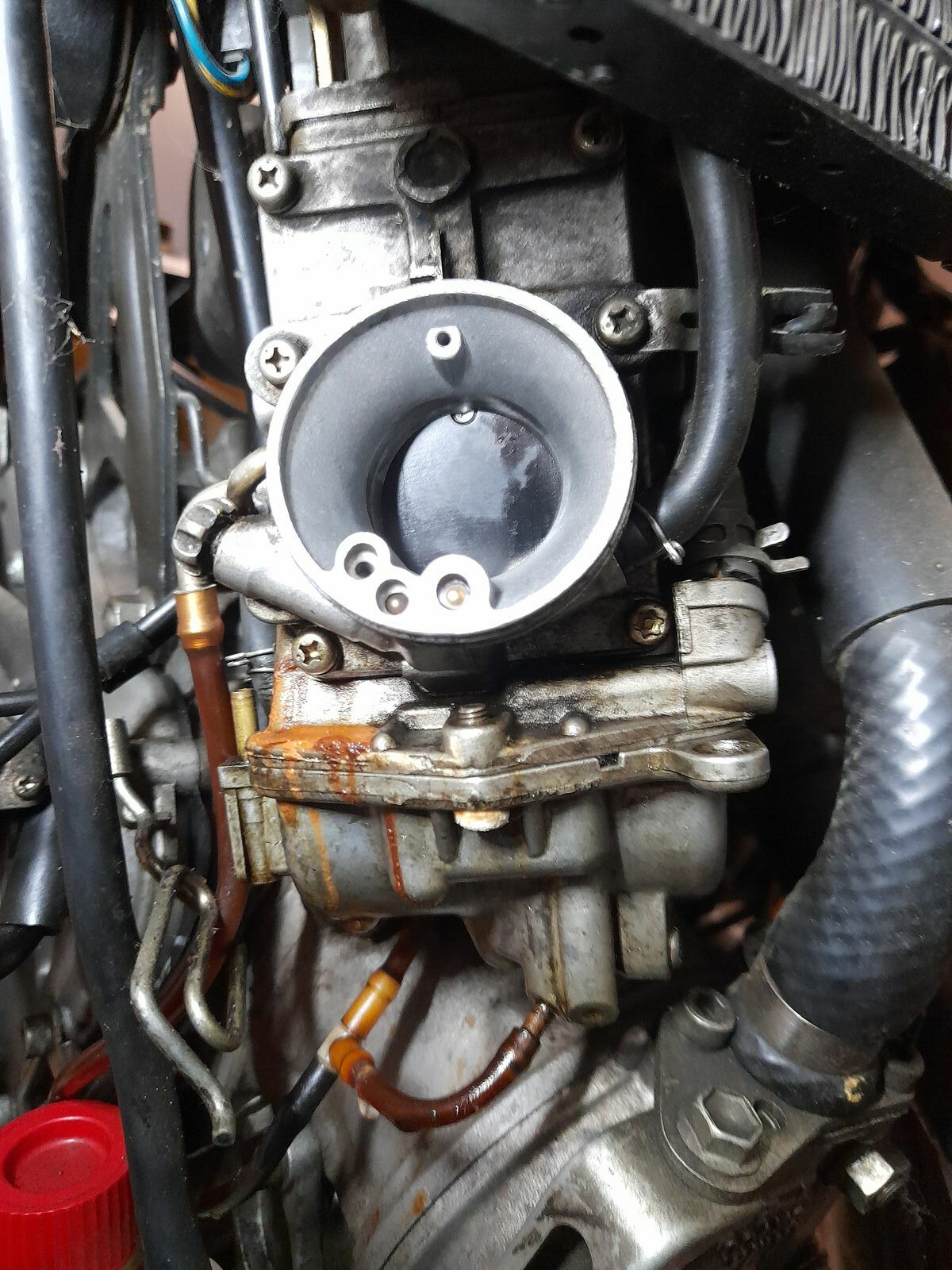 Nachdem das Motorrad nun läuft und angemeldet ist, schreibe ich ein paar Abschnitte, wie die Restauration vonstatten ging. Der Ausgangszustand war, das der Motor auf einem Zylinder nur mit Aussetzern lief. Die rechte Seitenverkleidung stand unten ab, weil beim unteren Mittelteil der Halter mit der Gummimutter fehlte. Auch das Seitenteil wies einige Risse auf und oben fehlte einer der Ansätze mit der Gummimutter. Die Maschine muss mal auf die rechte Seite geflogen sein. Im Tank oben vorn eine Delle. Die Farbe der Verkleidungs- Seitenteile entsprach den 92er Modellen, das Fahrzeug ist eine 91er. Die Räder sind rot lackiert. Bremse hinten fest. Der Kühler war zu einem leichten Parallelogramm verdrückt. Von irgendwo tropfte rostbraune Kühlflüssigkeit.