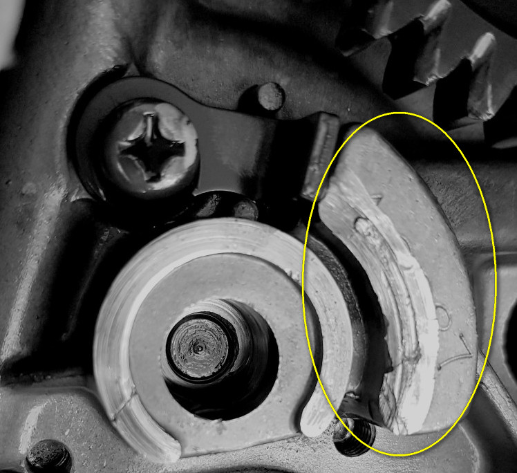Das hier ist der Anschlag, geht kaputt, wenn der Kupplungsdeckel mit nicht richtig eingesetzter bzw. vorgespannter Kickstarterwelle drauf montiert wird: