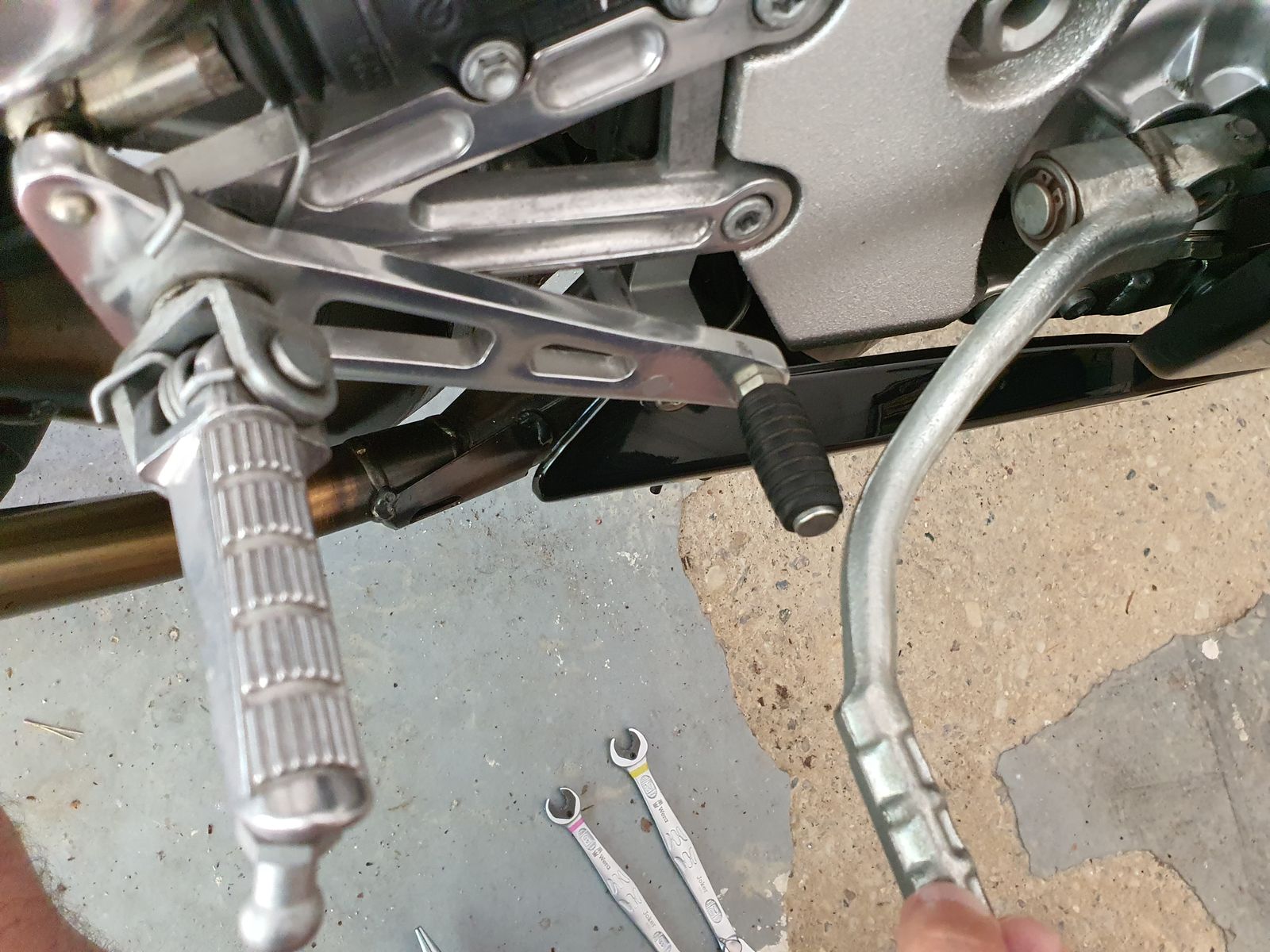 Ihr Lieben, 1000 Dank! Es war tatsächlich die total verkorkste Einstellung des Bremshebels. Die Kontermutter der Schraube für den Bremslichtschalter war von unten (!) gegengeschraubt. Jetzt passt es, yeah!