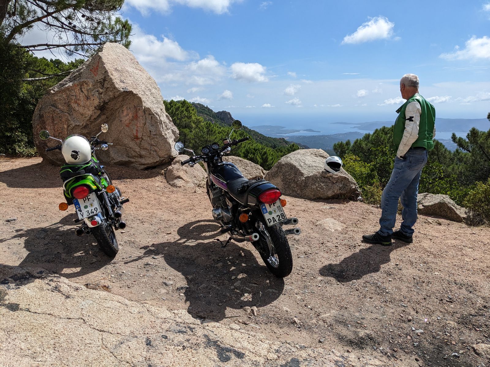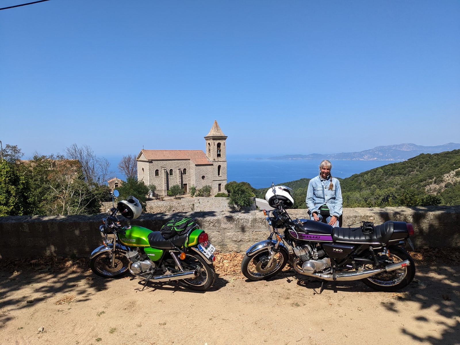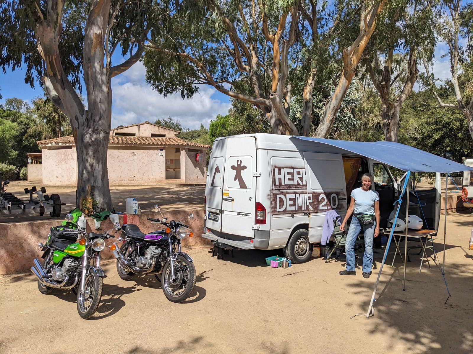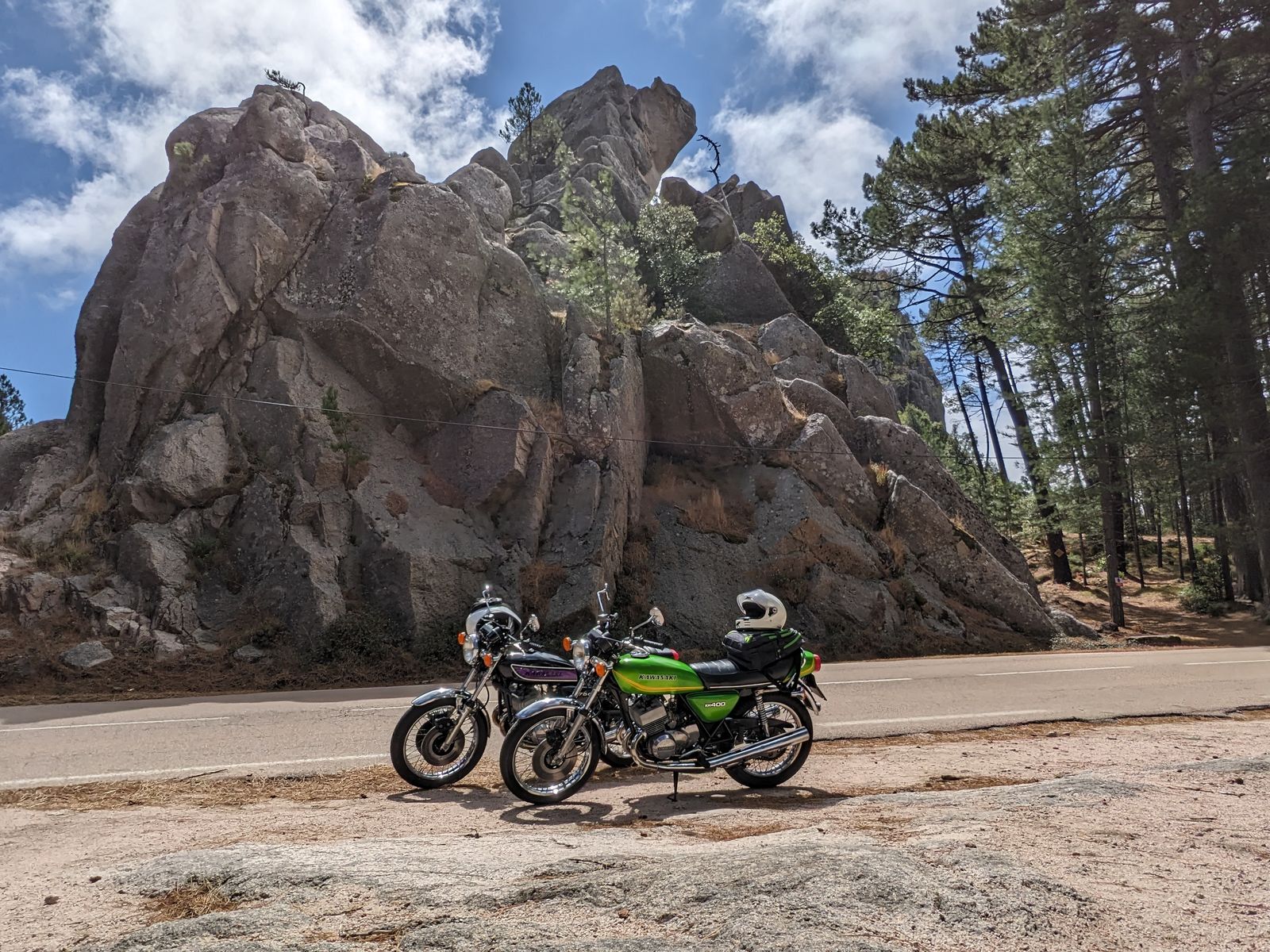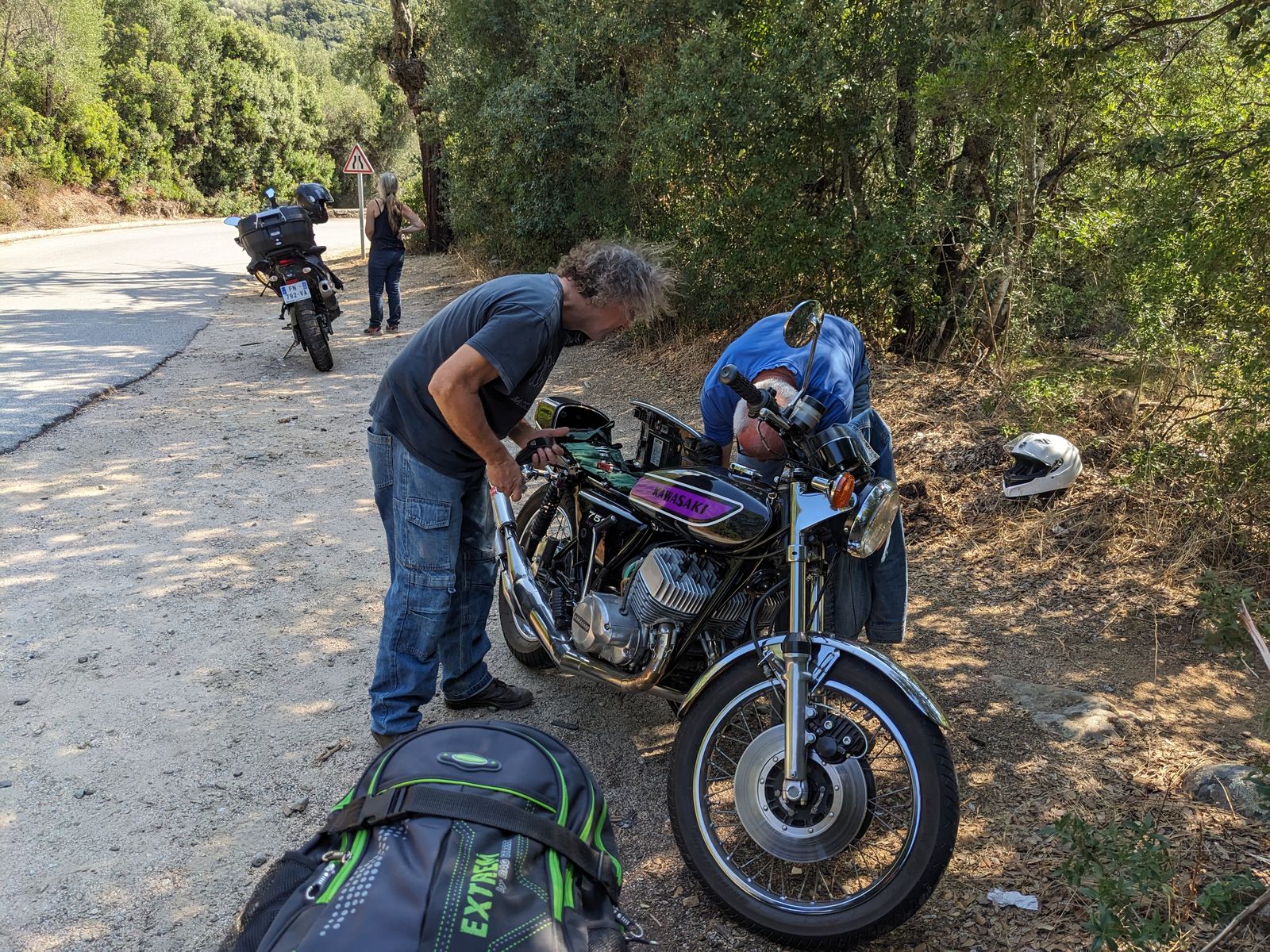 auf der Insel zurückgelegt , was viel zeit in Anspruch nimmt , geht man von einem realistischen Durchschnittstempo von etwa 40 Km / Std aus - selbst dafür muss man alles andere als trödeln ! Die erste Woche waren wir im Südosten der Insel unten bei Porto Vecchio zu Zweit --Ute mit ihrer KH 400 und ich mit der H2-C- Die Mopeds waren recht zuverlässig - ich musste allerdings einmal die H2 mit dem Sprinter 3 Km entfernt zurückholen . Ursache waren gar fürchterliche Geräusche unter dem Kupplungsdeckel - welche sich als gelöste Schrauben des Kupplungspaketes erwies. Die Schrauben sind ja federbelastet und gehen normalerweise nie auf -- aber es gibt immer was Neues was einem widerfahren kann -- Kawasaki ist da jedenfalls sehr unterhaltsam . Meine Benzinschläuche haben sich auch binnen weniger Tage nacheinander verabschiedet ( obwohl extra die teuren von Stiehl montiert waren ) -- Jetzt sind schwarze, korsische, gewebeverstärkte vom freundlichen Yamahahändler in Porto Veccio montiert .