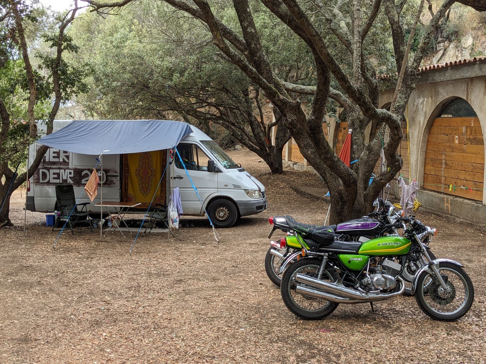 .. kurz oberhalb von Propriano liegt der Campingplatz "Chez Antoine) .. nicht wirklich parzelliert und noch sehr natürlich mit altem Baumbestand und ausreichend Schatten - auch nicht ausgebucht .. Die Hütte der Nordlichter lag allerdings etwas weit oben im Gelände , weshalb die beiden gemeinsam mit der TDR zum Strand kamen ...