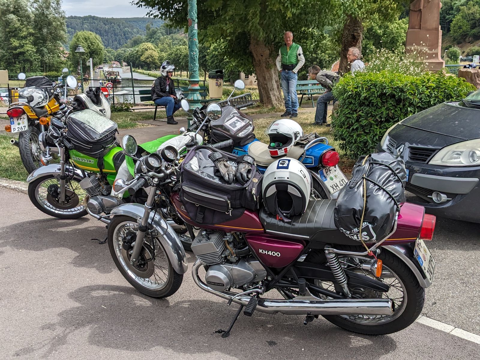 der Fuhrpark in Bad Bellingen an der Pizzeria ... - im vordergrund die H2 mit XL Tank für weitere Anfahrten von J.P. aus Paris - wieder auf eigener Achse ,wie so viele der Anderen - welche aus dem Süden teils über 2 Tagesetappen angereist oder aus der Normandie von der Atlantikseite kamen :smiling_face_with_sunglasses:..