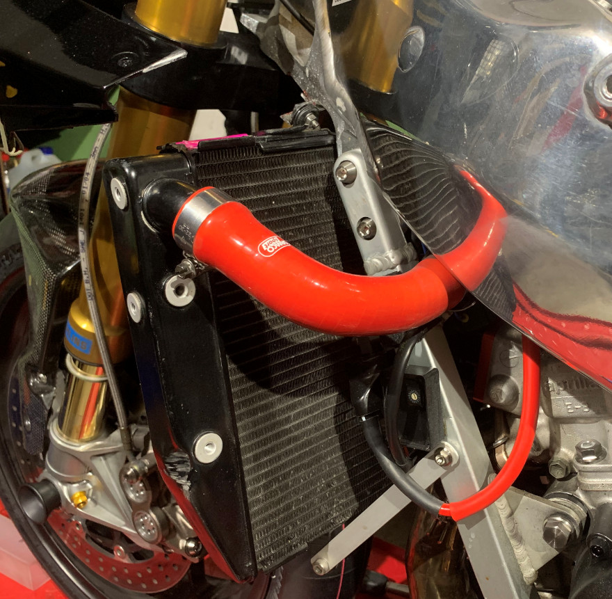 Veto! Wenn man es vernünftig machen möchte, schmeißt man das ganze Thermostatgeraffel raus, benötigt kein Mensch auf der Rennstrecke. Der Yamaha Kühler passt m.E. nur vernünftig, wenn die original Halterungen an den Unterzügen abgeschnitten werden. Linke Seite passen die Yamaha Anschlüsse für den Kühlkreislauf, rechts muss der Stutzen am Kühler abgeändert werden: