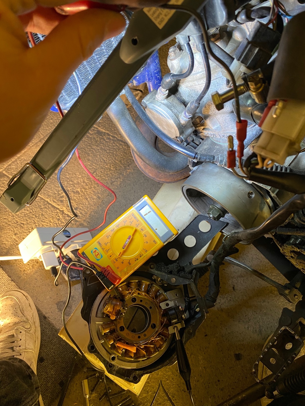 Soo jetzt mal ein Update von meiner Seite. Habe heute die Lichtmaschine ausgebaut. Habe mit Multimeta alles gecheckt und es scheint als ob mein Pickup wirklich kaputt ist. Konnte keiner Werte ablesen. Melde mich wenn ich bestätigen kann dass, das der Fehler war. Anbei ein paar Fotos für die die es interessiert. Auf dem letzten Foto kann man meine Messung sehen. Danke schonmal an alle die mir weiter geholfen haben und tipps gegeben haben!