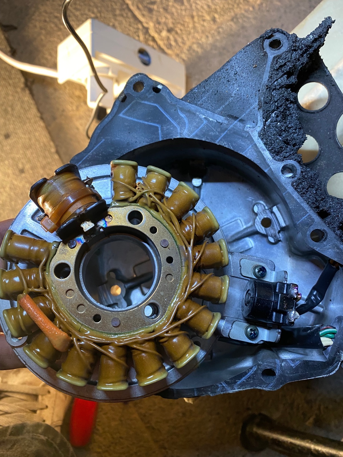 Soo jetzt mal ein Update von meiner Seite. Habe heute die Lichtmaschine ausgebaut. Habe mit Multimeta alles gecheckt und es scheint als ob mein Pickup wirklich kaputt ist. Konnte keiner Werte ablesen. Melde mich wenn ich bestätigen kann dass, das der Fehler war. Anbei ein paar Fotos für die die es interessiert. Auf dem letzten Foto kann man meine Messung sehen. Danke schonmal an alle die mir weiter geholfen haben und tipps gegeben haben!