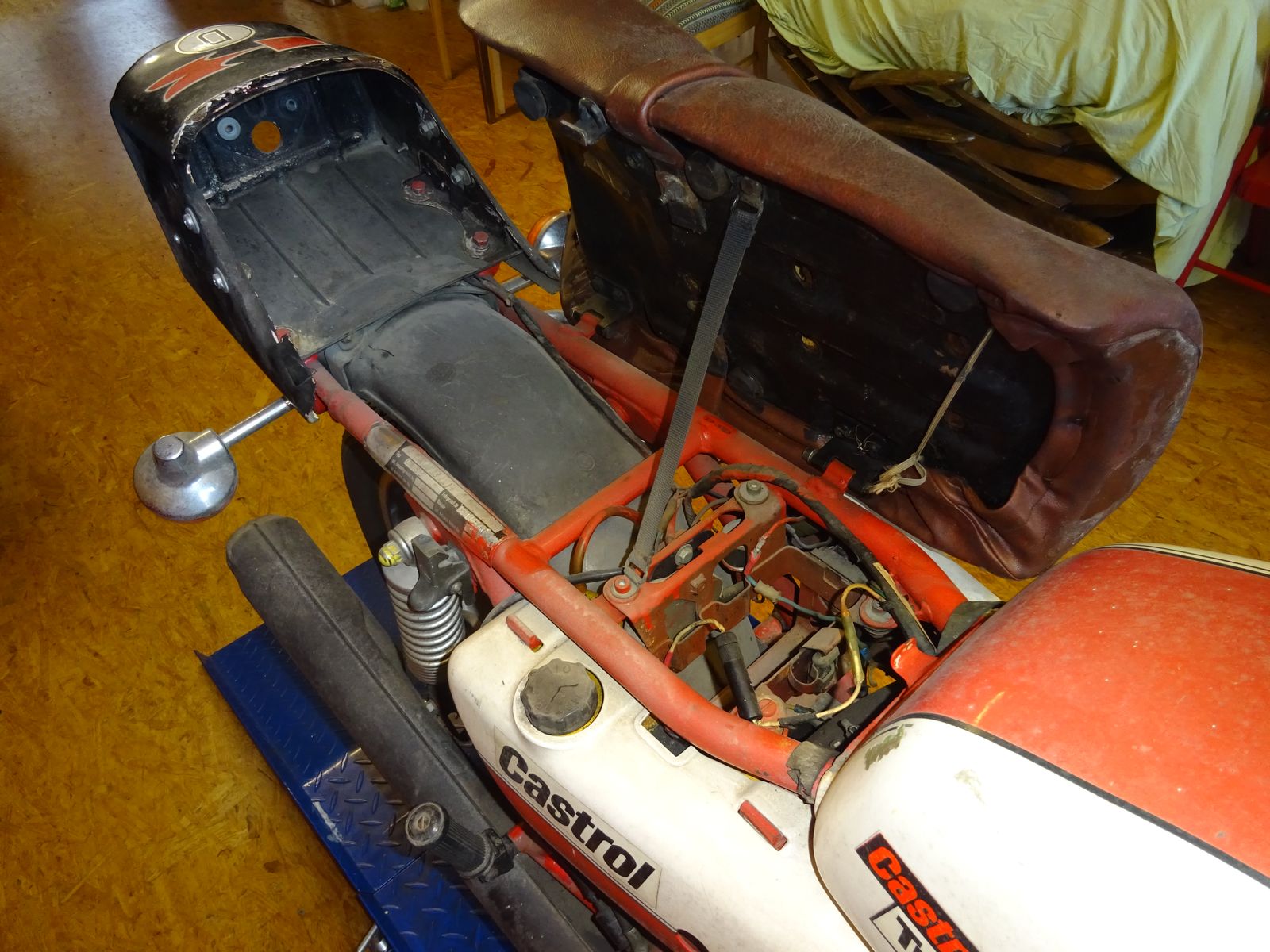 Heute ist die Kleine angekommen -- abgemeldet in den frühen `80zigern und in der Ecke verstaubt -- besonders gut hat sie es offensichtlich im letzten teil ihres Daseins nicht gehabt. Falsche und zu lange/ kurze Schrauben etc und einen horriblen Kabelbaum mit vielen, vielen Farben und Lüsterklemmen , der es jetzt hinter sich haben sollte ....