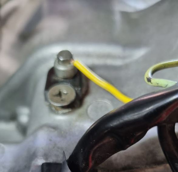 Eine flimsige Kupferblechzunge wird über einen Nocken der Schaltwelle auf Masse gedückt.