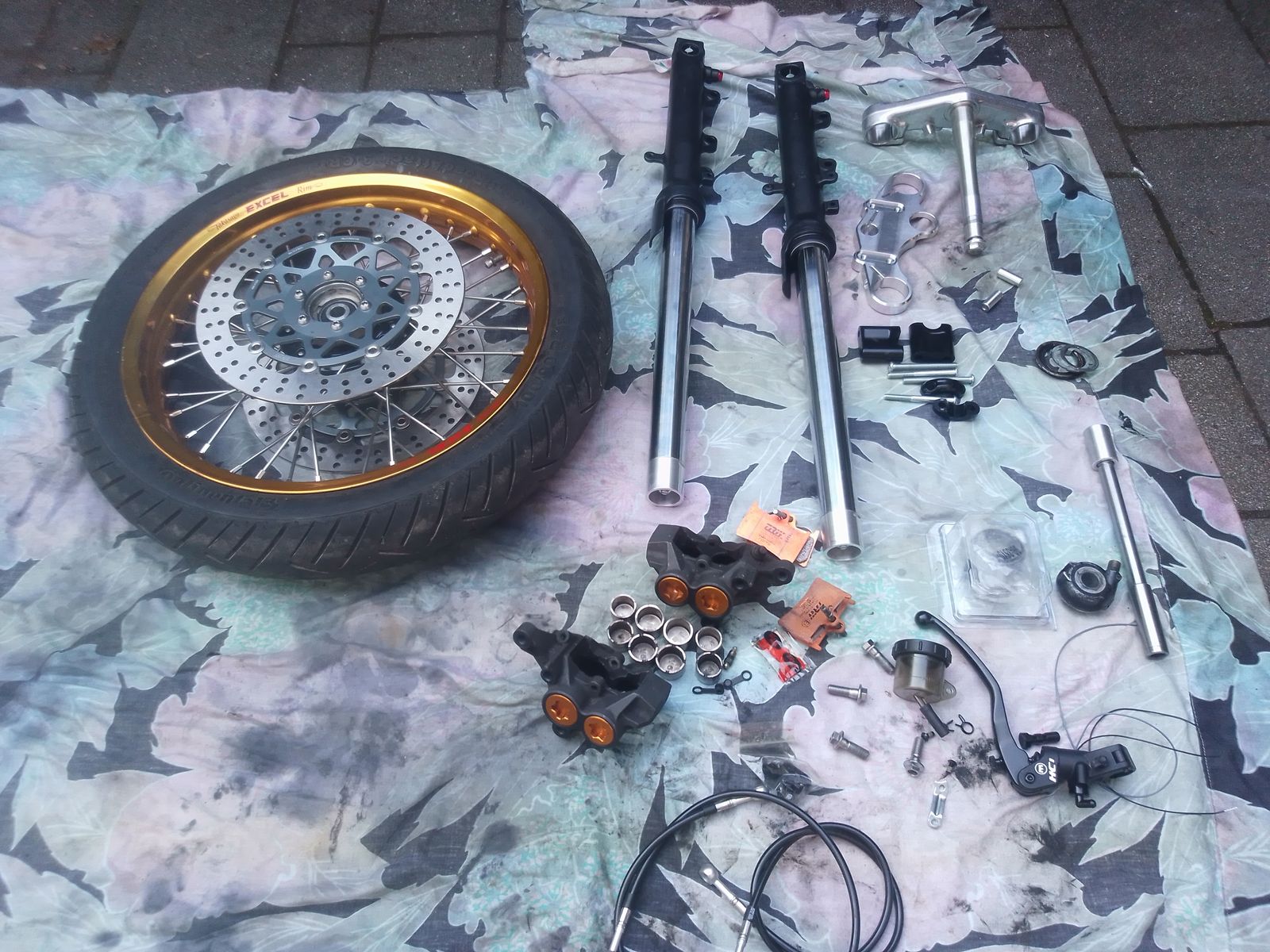 Eine SR 500 Nabe, auf die mein alter Felgenring eingespeicht wurde, 2 x 300er TRW Scheiben mit Adapterringen und eine 17er Achse mit einer Gewindehülse, die in den Gabelfuß geklemmt wird.