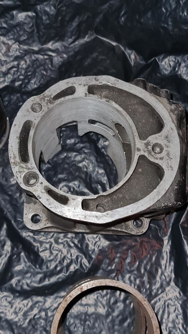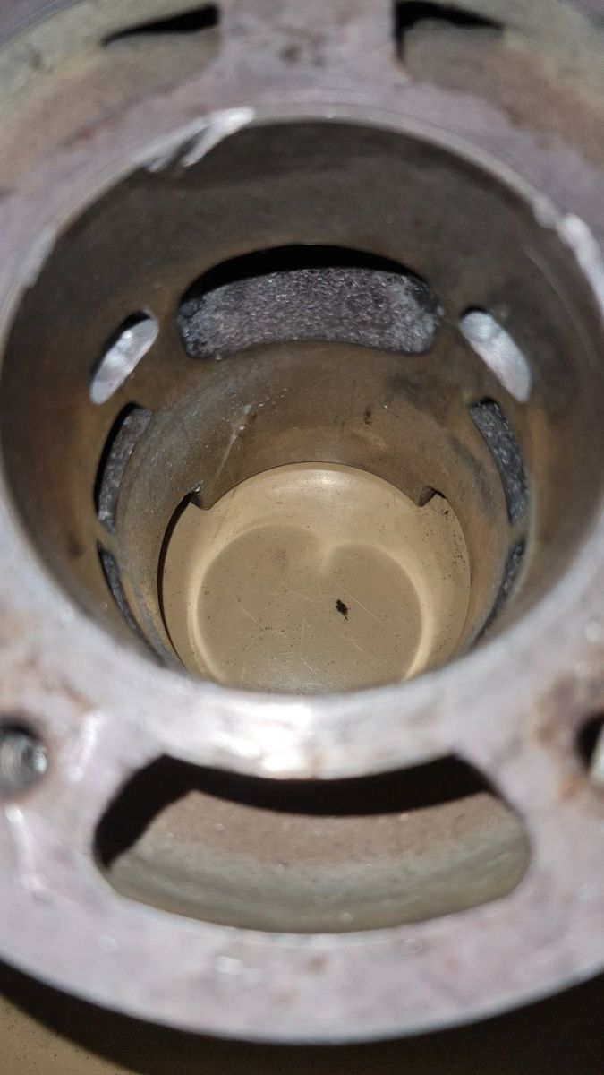 Hier der Zylinder mit ausgewaschenen Auslaß Zylinder hatte hier 57 mm. Bei vorgebohrten 59 mm sah es auch nicht viel besser aus.