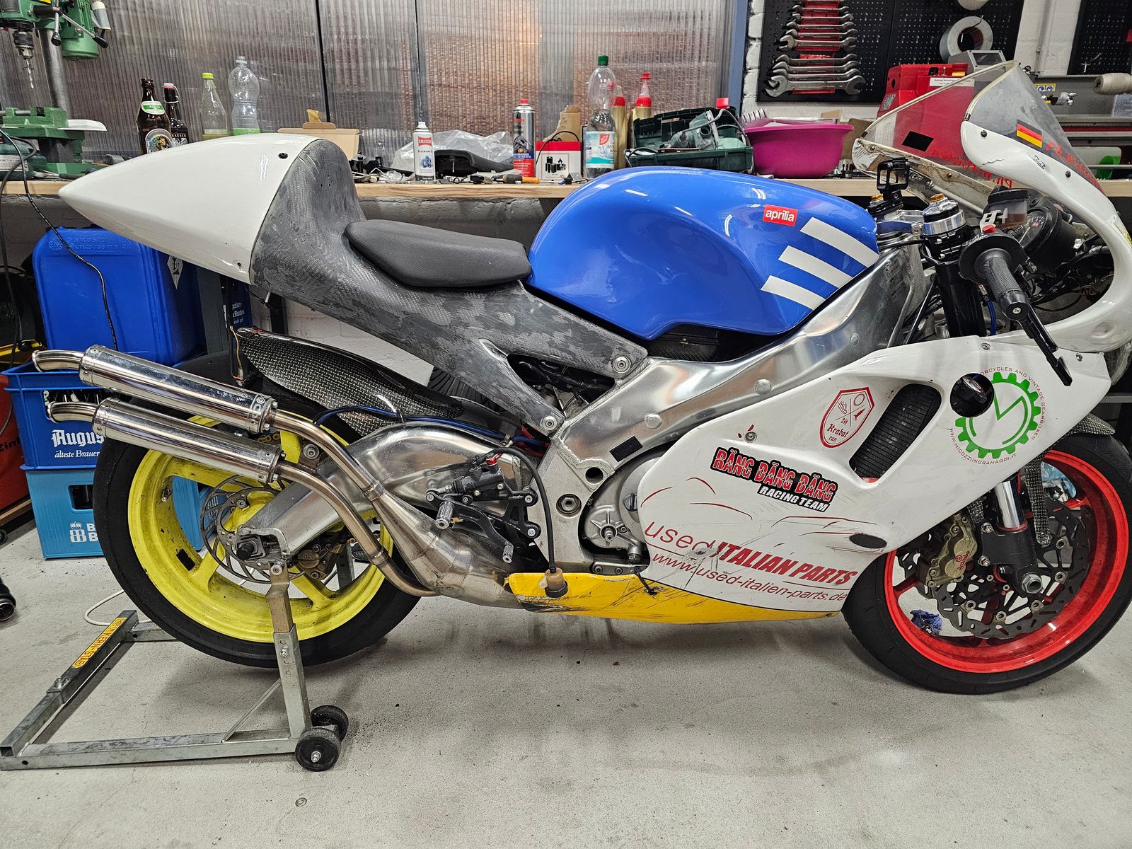 Bitte sehr. Heru Glasfaserverkleidung mit flachem Oberteil und orig. Aprilia Scheibe. Wichtig: Du brauchst natürlich ein anderes Geweih! Heru bietet auch eines aus Carbon an. Ich hatte mir auf "schnell" was gebastelt um zum damaligen Ringtermin fertig zu werden, daher war hier auch noch keine Farbe drauf.....