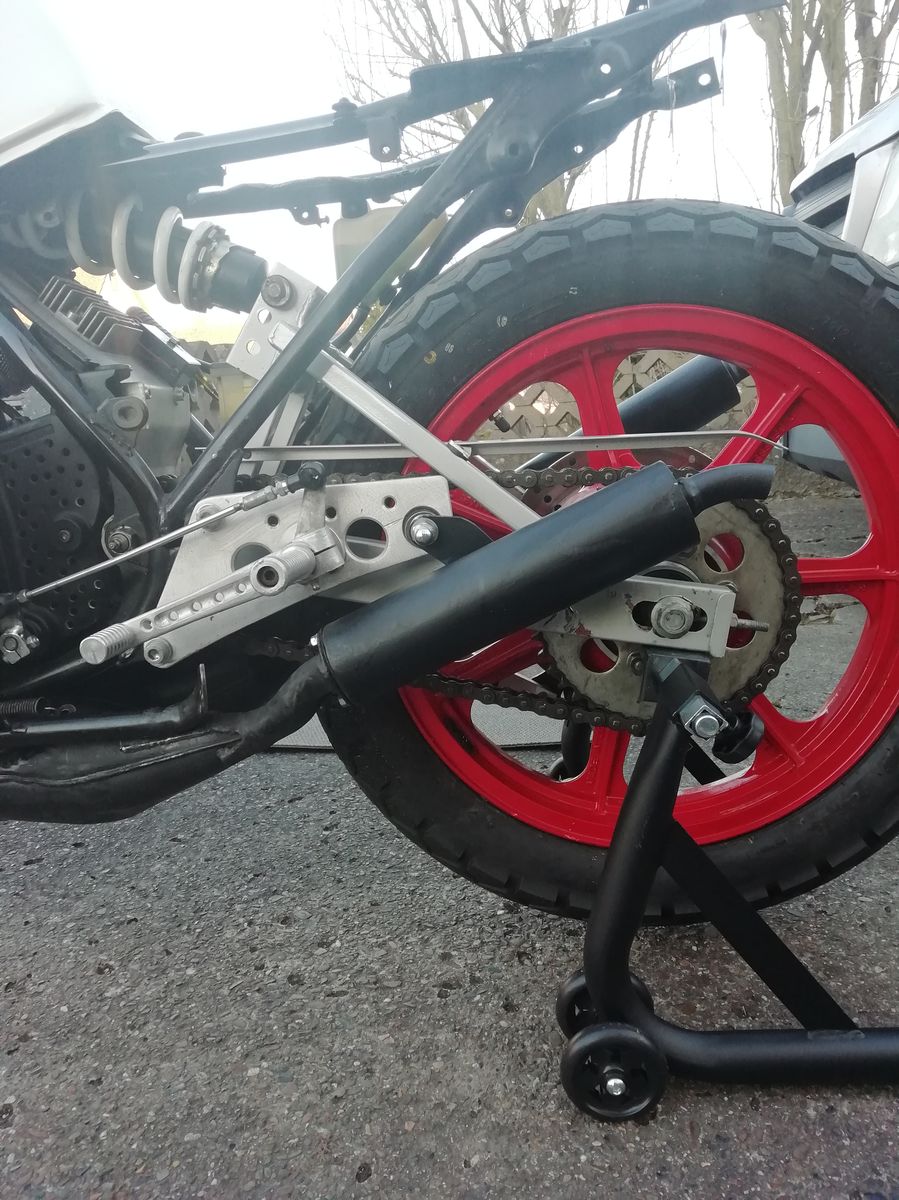 Die meisten Sachen, wie Gerstenmeierverkleidung, Fußrasten, Leichtmetallfelgen etc. sind eingetragen. Was allerdings fehlt, ist die Bremsanlage (vorne wurde meinen Recherchen nach eine Doppelscheibe der GSX600F Bj. 88-97, verbaut um die originalen 270er zu ersetzen), hinten bin ich mir absolut unsicher. Scheint eine Eigenbau-Schwinge (auf Grundlage TZR250?) zu sein, da die Führung und Anbringung des Bremssattels ähnlich ist (unterhalb der Schwinge, statt oberhalb).