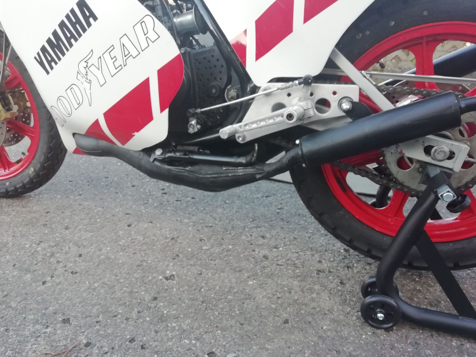 Die Zweite Frage hätte ich bzgl. der Auspuffanlage: Ebenfalls TZR250? Jedenfalls laufen die Krümmer direkt hinter den Zylindern über Kreuz, und die Dellen im Bereich des Gegenkonus bspw. deuten ebenfalls auf eine Anlage hin, die original ist (aber der der TZ350 nachempfunden, da über Kreuz)... leider finde ich nirengs Typenbezeichnungen/Stanznummern.