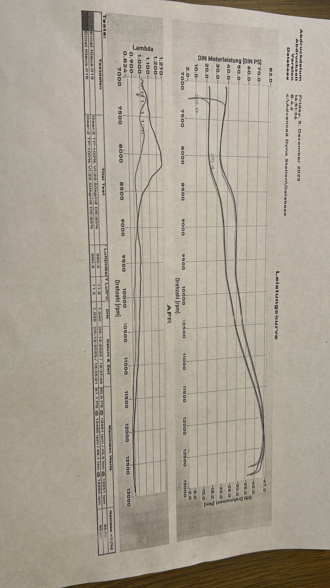 Durch die recht hohe Auslasssteuerzeit konnte ich die relativ hohe Überströmersteuerzeit der Serienzylinder ausgleichen. Die Verdichtung wurde ebenfalls niedriger gewählt und der Quetschspalt eher konservativ auf 0,9mm angepasst. Das Resultat konnte sich sehen lassen. Ein großes Leistungsband von 8500-12700 1/min in Verbindung mit hoher Spitzenleistung, trotz fetter Abstimmung. Keinerlei Detonationen.