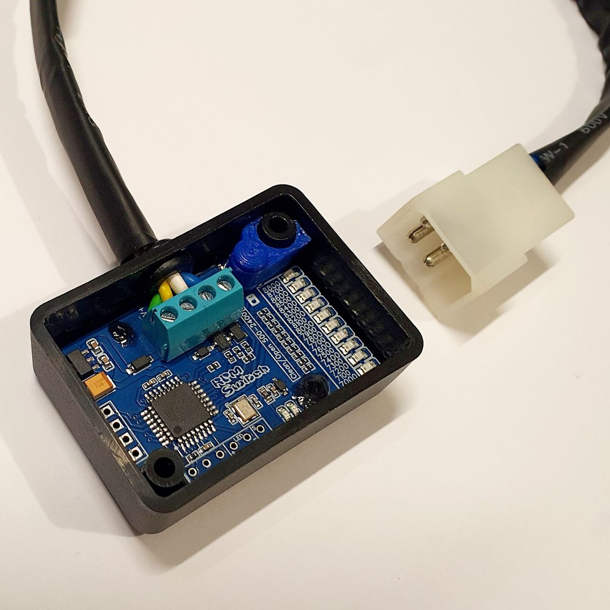 Einstellbar von 7000-8800 Umdrehungen, Selbstreinigung (500-2400) ein/aus, Drehzahlsignal von Generator oder Pickup, und einige Extras wie Status-Led und Servo Ausgang.