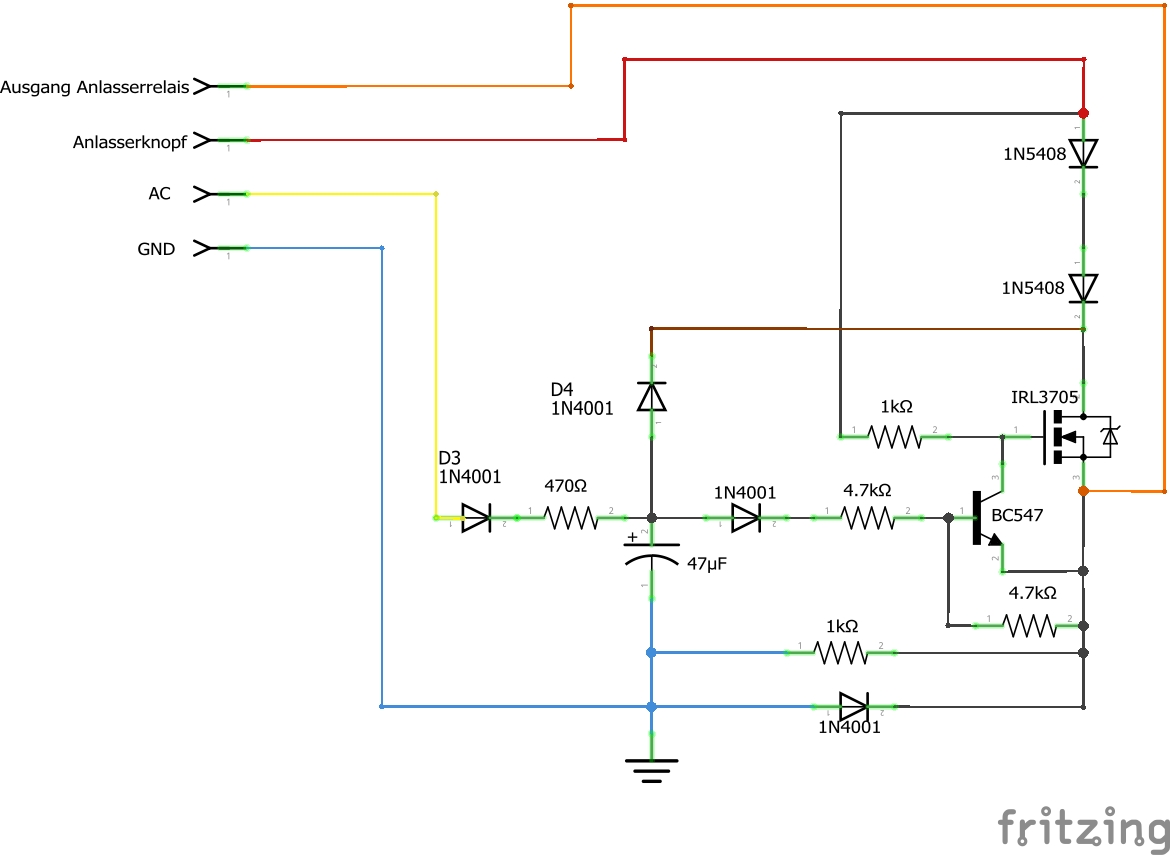 * Drückt man den Startknopf, liegen 12V über den 1K Ohm Vorwiderstand am Gate des FET an, der FET steuert durch, durch die beiden 1N5408 Dioden bleibt immer noch 1,4 Volt Spannungsabfall übrig, um das Gate weiter zu treiben, der Transistor bleibt durchgeschalten und gibt die 12V an das Anlasser Relais weiter.
