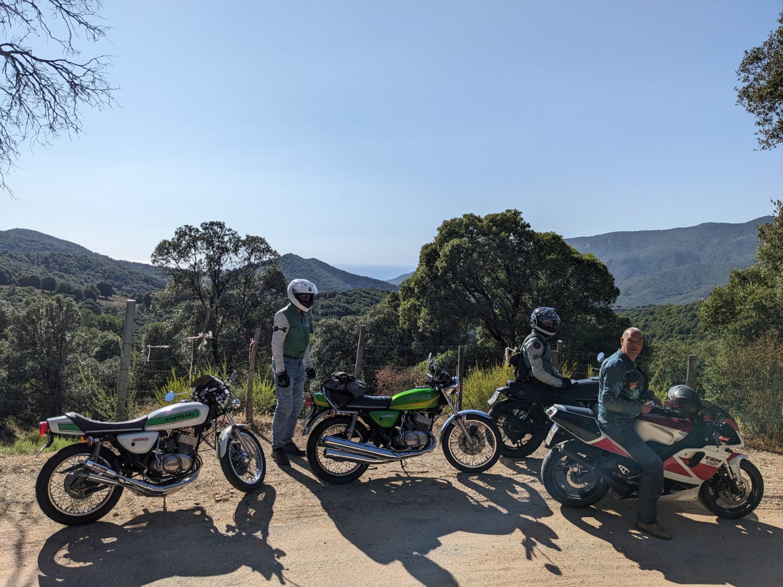 das Team Green mit Dirk , der uns schon mehrmals mit Dreizylindern begleitet hatte -- diesmal nur noch mit Kawajacke und seiner Guzzi - einer ehemaligen Rennziege