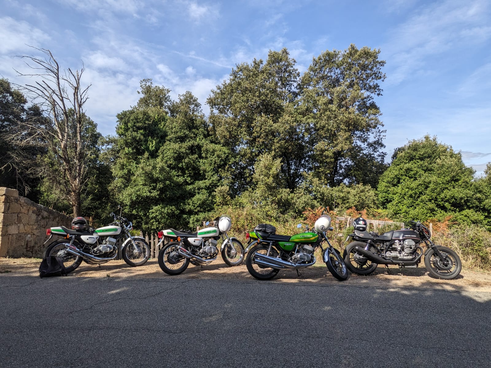 das Team Green mit Dirk , der uns schon mehrmals mit Dreizylindern begleitet hatte -- diesmal nur noch mit Kawajacke und seiner Guzzi - einer ehemaligen Rennziege