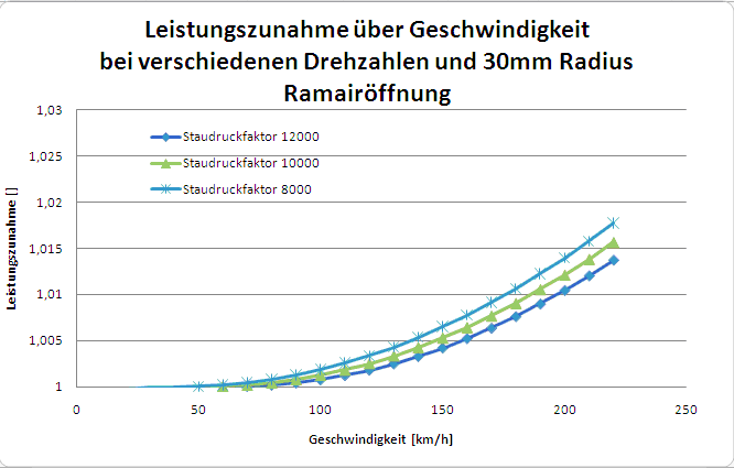 Ramaireffekt berechnet aus Temperaturdifferenz, weil die RS ja unterm Sitz die warme Luft ausm Kühler ansaugt und so die kühle Luft von vorne bekommt und der reine Ramaireffekt bei 30mm Radius der Eintrittsöffnung an der Verkleidung vorne bei Drehzahlen um 8000, 10000 und 12000.