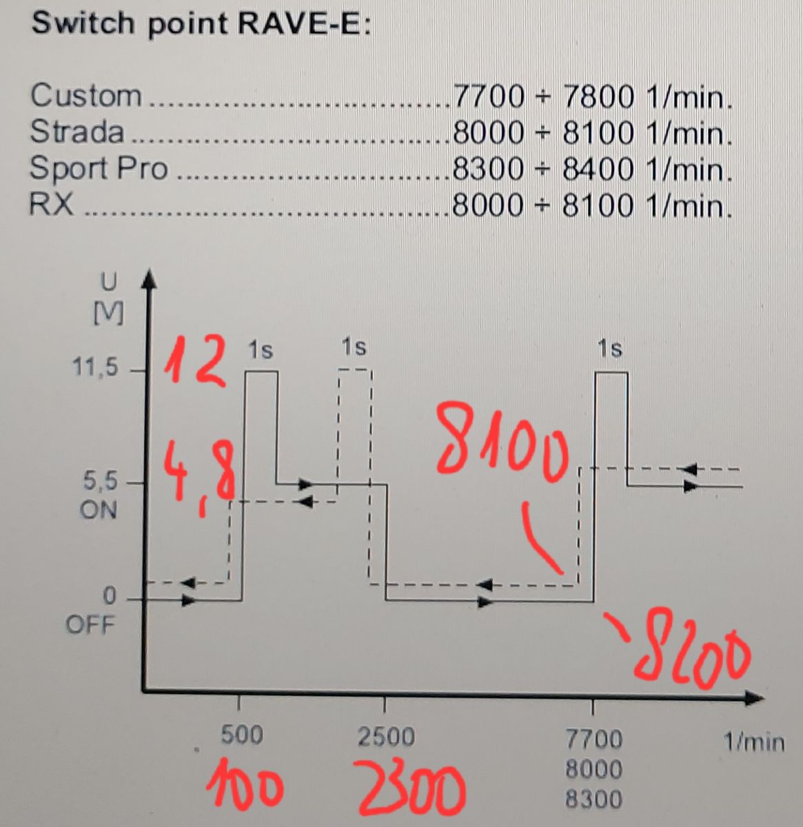 Es gibt original 3 Raves; 7.800, 8.100, 8.400 1/min. Leider passen bei mir alle drei Schaltwerte nicht. Ich habe also nach einer Lösung gesucht, das original Steuergerät "umzuprogrammieren". Hierfür habe ich ein 7800er Steuergerät geöffnet, d.h. die Vergussmasse mühselig weggemeiselt um an die Schaltung zu gelangen. Leider hat dieses Vorhaben eher schlecht als recht funktioniert.