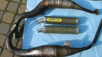 Bite hier meine Arrow Cup Anlage, die ältere Version mit drei Loch Verschraubung, die Anlage ist in gutem Zustand, nicht geschweisst und nicht verbeult, mit dabei alle Halter sowie neue Auspuffflansche.Endschalldämpfer sind um 5 cm gekürzt, sehr guter klang!