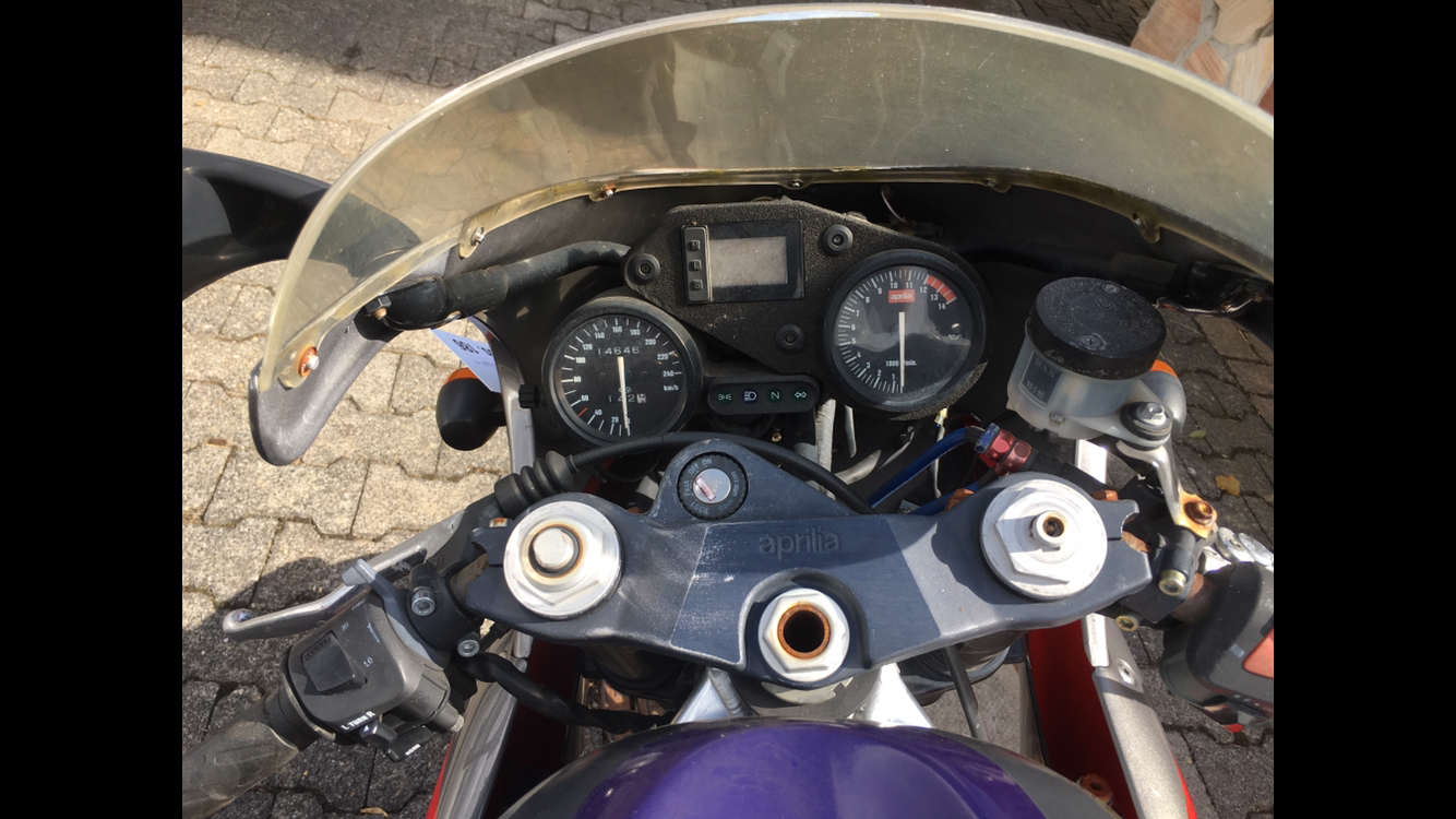 Ich habe den Traum einer 250er, angesichts der Preise auf mobile usw, schon aufgegeben aber durch einen glücklichen Zufall bin ich auf dieses Moped bei einer Auktion gestoßen. Ich war eigentlich auf der Suche nach Drehmaschinenzubehör im Internet und plötzlich konnte ich meinen Augen nicht trauen. Es wurde wirklich bei einer Auktion, in einem „Kuhkaff“, wo es viel Schrott zu ersteigern gab (aber auch ein paar wirklich gute Sachen), eine RS 250 angeboten. Sie hatte laut Beschreibung allerdings eine Motorschaden. Außerdem stand sie wohl sehr lange draußen und hat an manchen Teilen schönen Rost angesetzt. Die Auktion begann zu dem Zeitpunkt erst in knapp über einer Woche. Die ganze Woche über habe ich jeden Tag wieder reingeschaut ob sie auch noch weiter angeboten wird. Da stand zwar, dass Vorabbesichtigung und Zwischenverkäufe ausgeschlossen sind aber man kann ja nie wissen. Ich konnte die Woche über an fast nichts anderes mehr denken und fragt mich für wie viel die Maschine auslaufen würde. Startgebot lag bei 500€. Samstags war dann die Auktion und ich konnte die ganze Nacht nicht richtig schlafen bis es dann endlich Zeit war aufzustehen. Besichtigung begann um 8:30uhr. Ich war um 8:31 Uhr auf dem Gelände und sah mich um. Als erstes im Hof bisschen umgeschaut - nix, dann ab in die erste Halle: „Ah ja da steht die Triumph Spitfire, da der Buggy, da der restaurierte Traktor und ein paar Quads“. Alles voller Fahrzeuge aber keine Aprilia. Dachte schon ich hätte mich verguckt da ich annahm, dass alle Fahrzeuge zusammenstehen. Naja weiter gehen und suchen. Ab in die nächste Halle, durch die Tür und am Boden den ganzen Schrott gesehen. Dachte „ok hier liegt der Schrott und wohl keine Aprilia“. Aber falsch gedacht. Ich dreht mich nach links, da stand das Mofa was angeboten wurde, dahinter die Derbi und dahinter die Aprilia. Ich sofort hingegangen, natürlich „unauffällig“ und leicht desinteressiert um keine Irritationen zu verursachen. Da stand sie dann. Der erste Blick war ok. Scheint unfallfrei zu sein. Laufleistung 14646km, Baujahr 96. Beim genauen Hinsehen sah man dann das Ausmaß des Standschadens. Viel Rost, auch am Gabelholm. Die Bestandsaufnahme ging weiter: Kickstarter versucht runterzudrücken, geht nicht, überhaupt nicht. Naja ok dann ist der Motor halt komplett fest. Reifen nachgeschaut: Profil ist noch gut aber Baujahr 2003... Alles in allem ein schlechter Zustand, Schulnote 4-