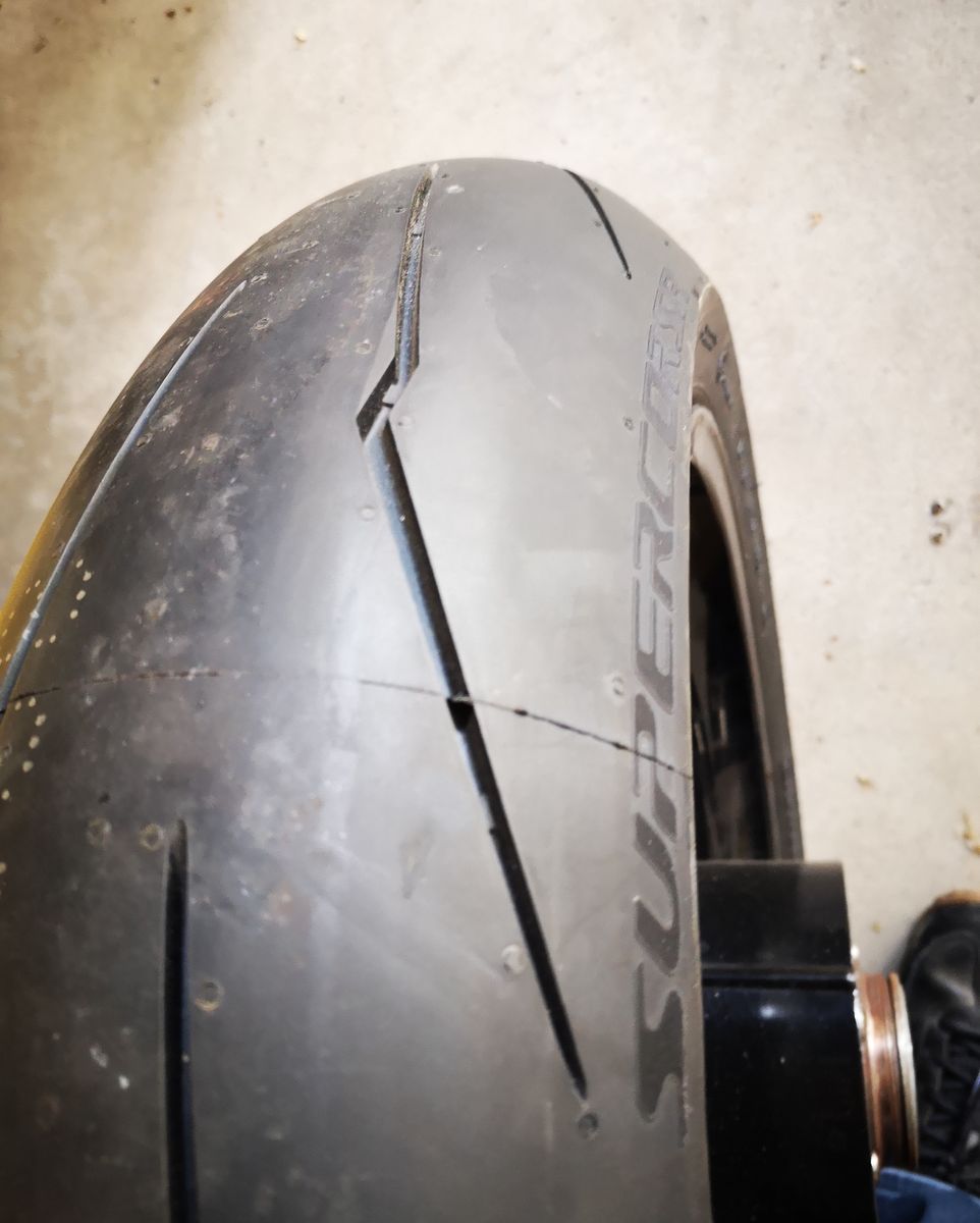 ...da ich für die Strecke mit dem RS10 hinten nicht ganz zufrieden war, habe ich einen Supercorsa aufgezogen. Die Kontur ist schon mal spitzer mit etwas steileren Flanken.