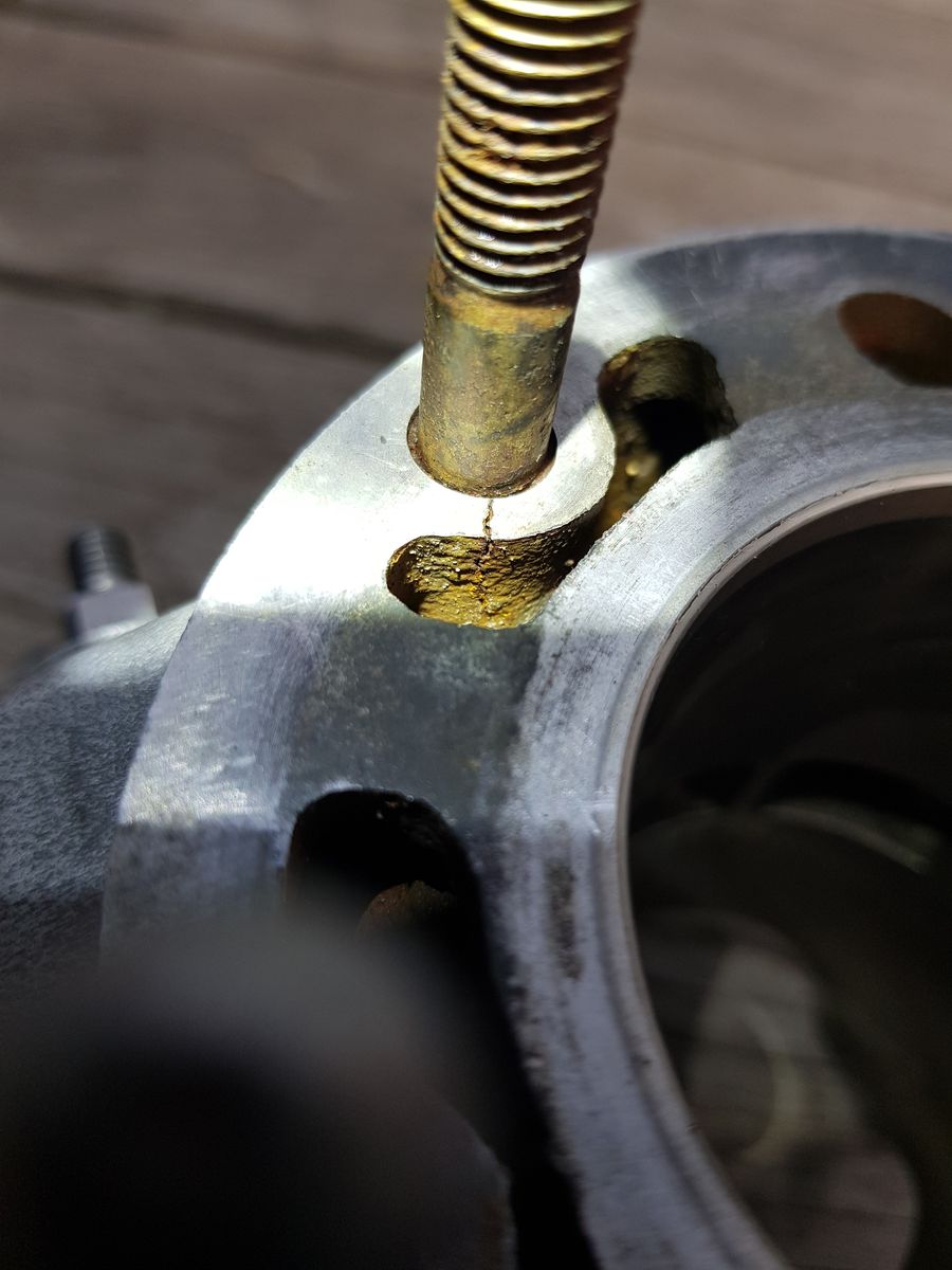 Beim Auffüllen des Kühlwassers war es so, dass es mir dort Wasser rausgedrückt hat, nach innen Richtung Brennraum scheint dicht, nach aussen scheint mir eben Wasser durch den Riss am Stehbolzen entlang raus zu laufen, selbst wenn kein Druck auf dem System ist.