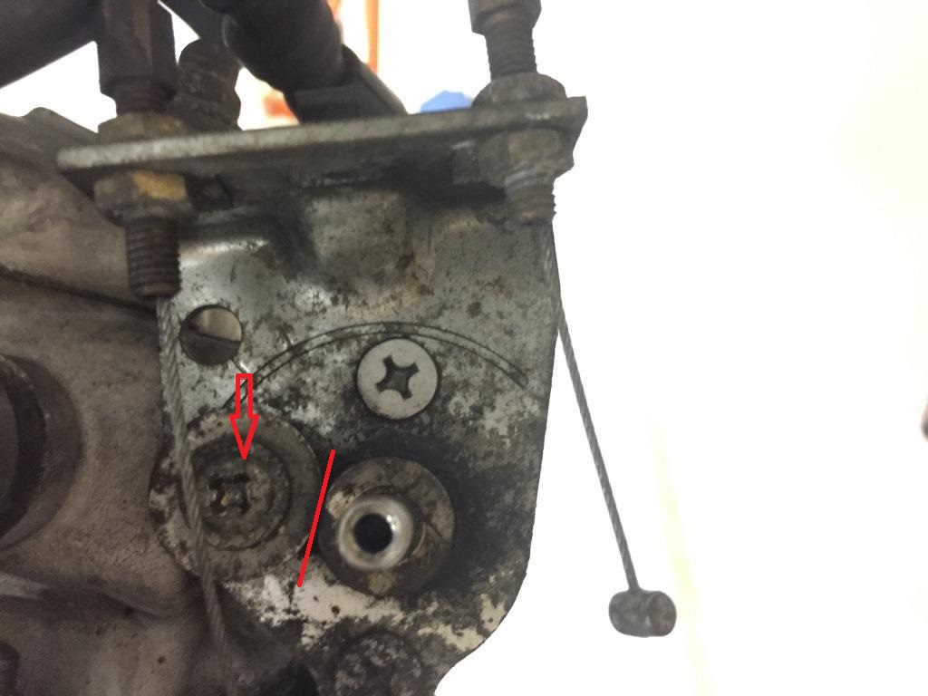 Bei der Wartung der Auslasssteuerung der RS250 ist mir dann ein Problem begegnet. Die Schraube (Pfeil rot) sitzt fest (auch nach WD40/Rostlöser) und ist ausgelutscht (weiß auch nicht wer solch schlechtes Material da verbaut).