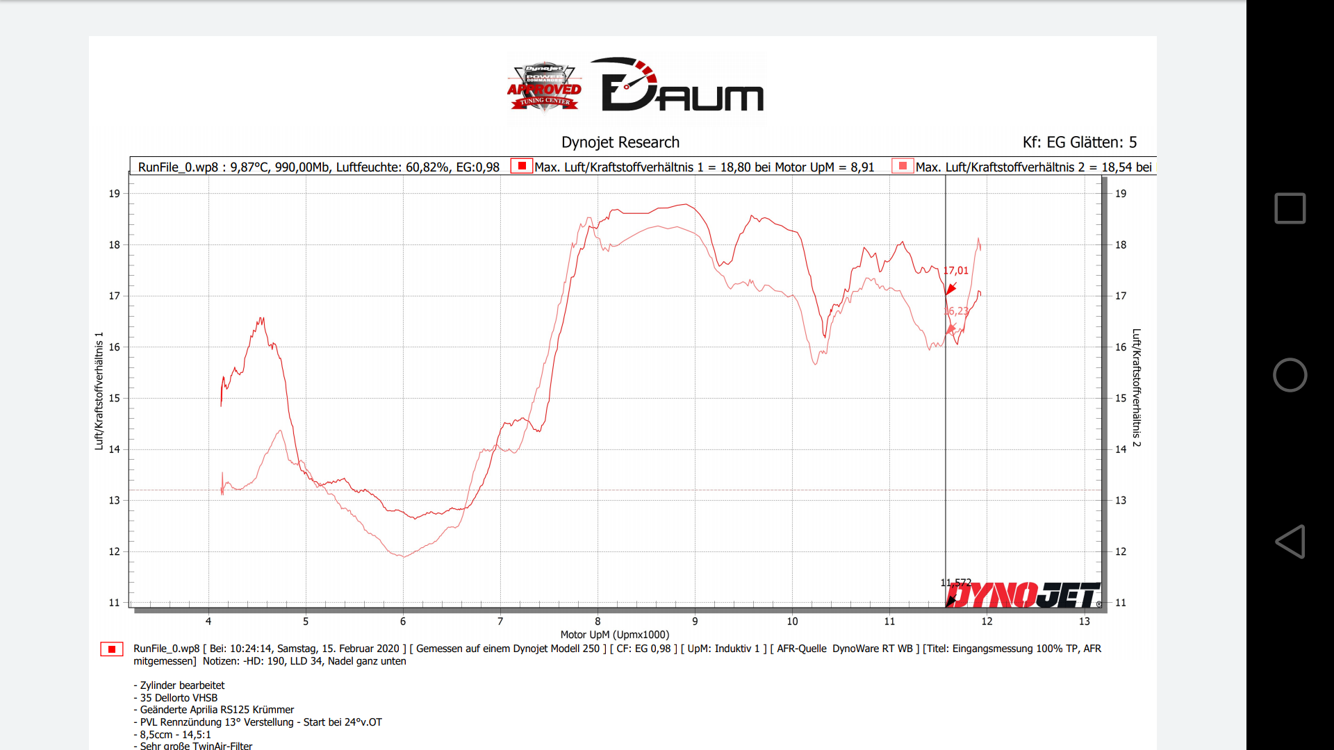 Leider hatten wir ein Klemmer und weitere Messungen erstmal sein gelassen. Sie lief Obenraus viel zu mager. Nicht desto trotz hat wir eine gute Unterhaltung und ich konnte Einblicke in die Big Bikes erlangen. Wir sehen uns nach der Reperatur auf jeden Fall wieder, hat Spaß gemacht. Die einzigste Messung ergab glaub ich 43/44 PS am Hinterrad mit AFR 18