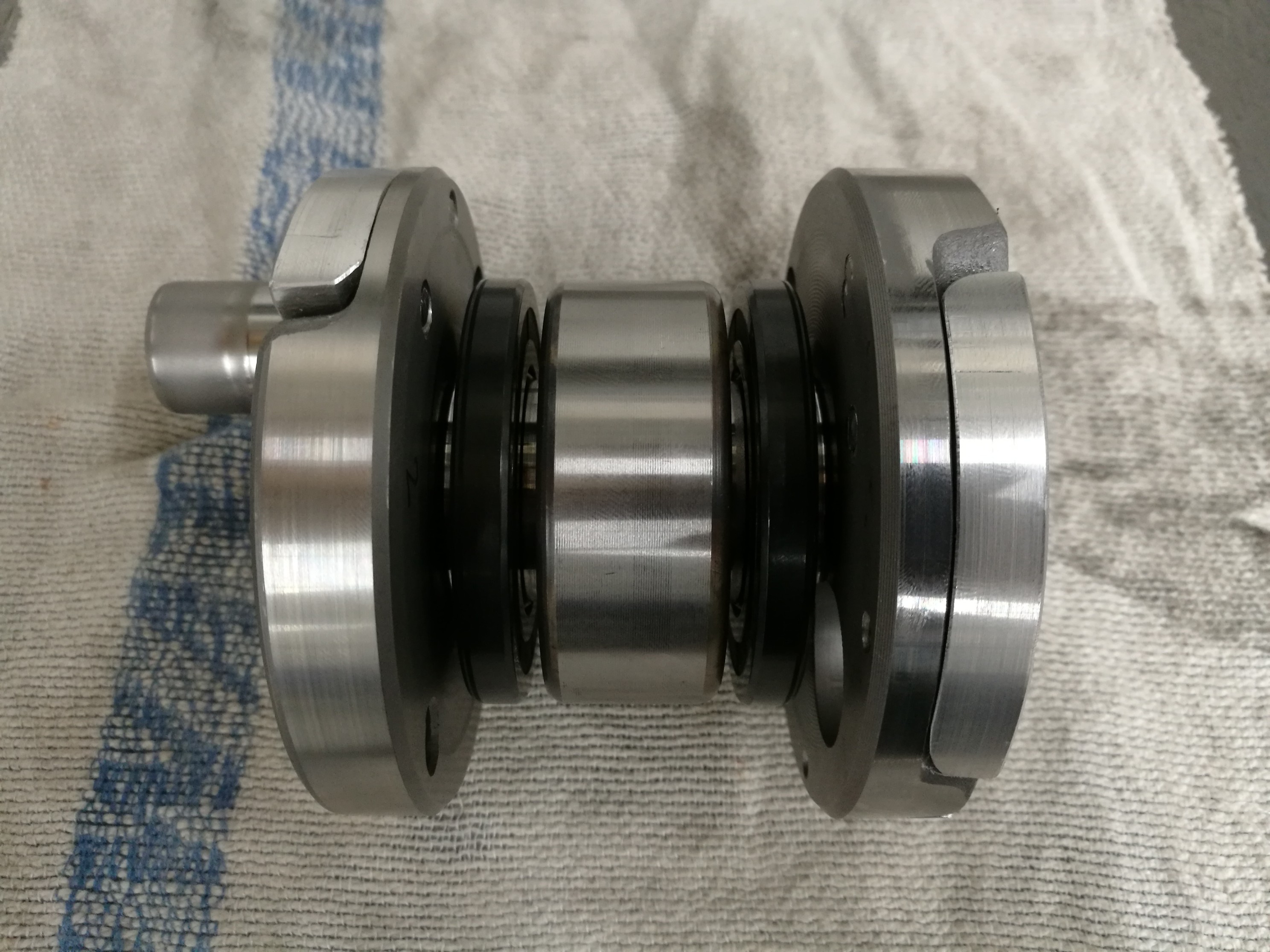 Da es scheinbar kaum noch anständige Anbieter gibt zum Kurbelwelle pressen, hab ich beschlossen es doch selber zu machen. Ich hab schon viele 1-Zylinder Kurbelwellen regeneriert und hab natürlich entsprechend Erfahrung. Problem war eigentlich nur den Versatz von 180° am Mittelteil zu realisieren. Kurzum hab ich mir jeweils pro Wange eine 12er Passung reingefräst, einmal enger als Sackloch und die zu fügende Wange mit Durchgangsloch mit Schiebesitz. So kann ich mit einer Führungssäule den Versatz herstellen. In der Mitte nimmt nun ein breites 4305 c3 Lager Platz. Die Simmerringe sind Standardware (33x62x7 Basl), dazu mussten allerdings die Lauffläche von 33,50 abgedreht und poliert werden (Drallfrei). Die Mopedde nimmt auch langsam Form an.