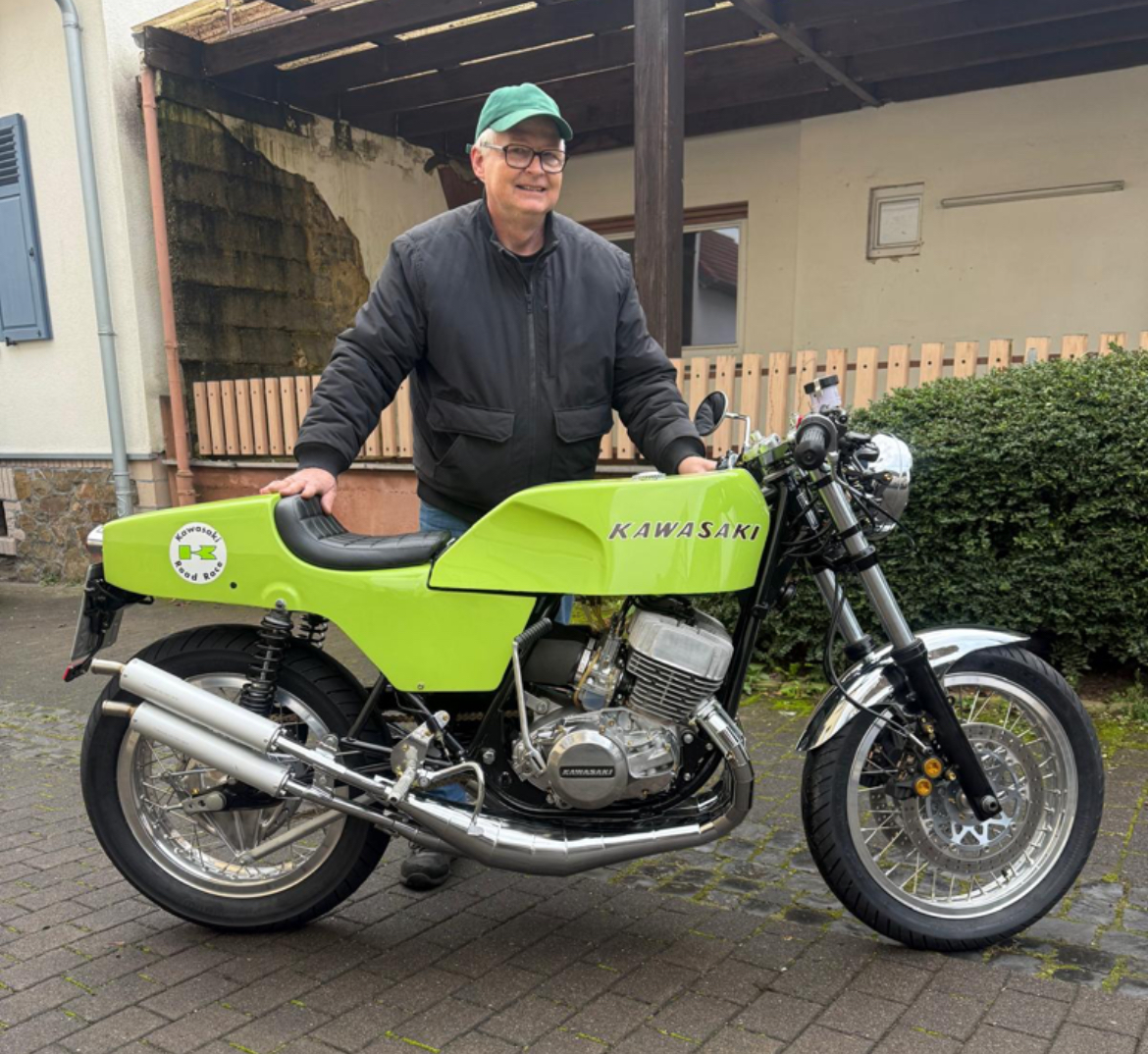 Reaktion (Beitrag)Ja Atze das Teil fährt richtig gut da kannst Du bei 190 nochmal richtig beschleunigen. Trockengewicht 170kg. Auch das Fahrwerk fühlt sich super an. Rahmen war auf der Richtbank, vorne die Yamaha Gabel. Lange Schwinge von B/C mit Nadellager, Ikons,… -